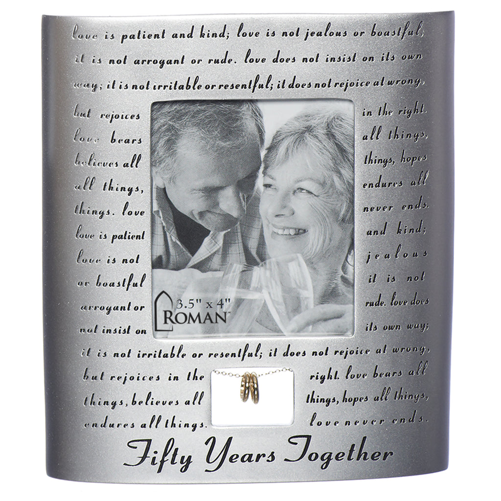 Honor a golden milestone with the 50th Anniversary Frame – Love Never Fails. Engraved with the beloved passage from 1 Corinthians 13 and accented with interlocking gold rings, this curved frame is a meaningful keepsake for any couple celebrating 50 years together. A timeless design, it’s a heartfelt way to commemorate enduring love and devotion.