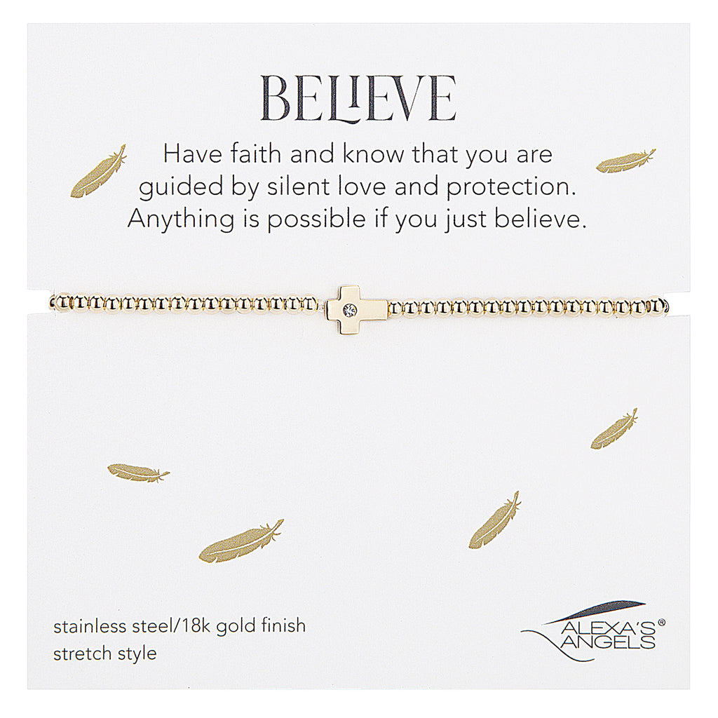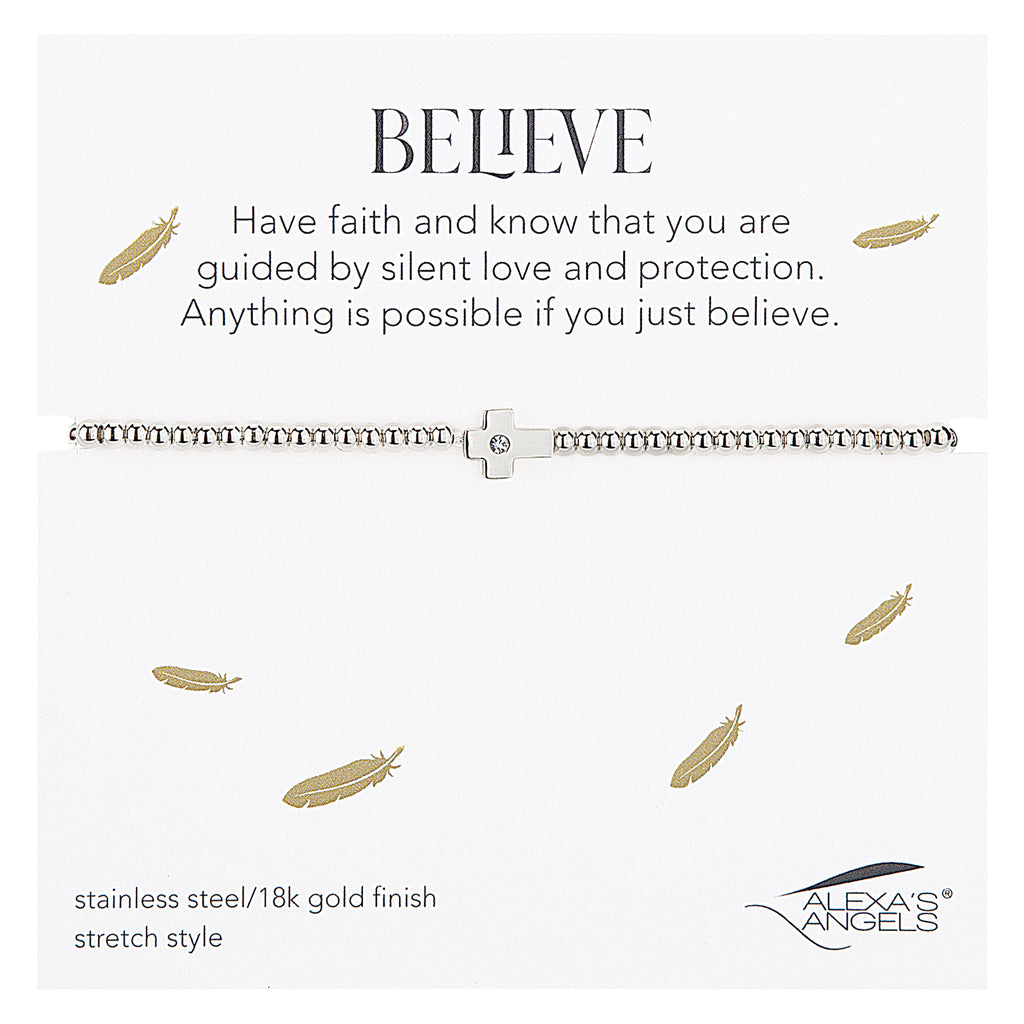 Let your faith shine with the "Believe" Cross Stretch Bracelet. Thoughtfully crafted with a delicate center cross charm, this bracelet serves as a daily reminder that with belief, all things are possible. Designed for all-day comfort with a flexible stretch style, it's available in both gold and silver finishes. The perfect meaningful gift or uplifting piece to wear as a personal affirmation of love, guidance, and protection.