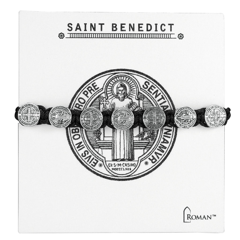 This bracelet features seven gleaming St. Benedict medals woven into a durable black cord, carrying centuries-old symbolism of faith, strength, and protection. The silver-tone pendants move gently with each gesture, while the adjustable design ensures both comfort and a secure fit. A meaningful devotional accessory, it’s ideal for prayer, daily wear, or as a thoughtful gift of encouragement.