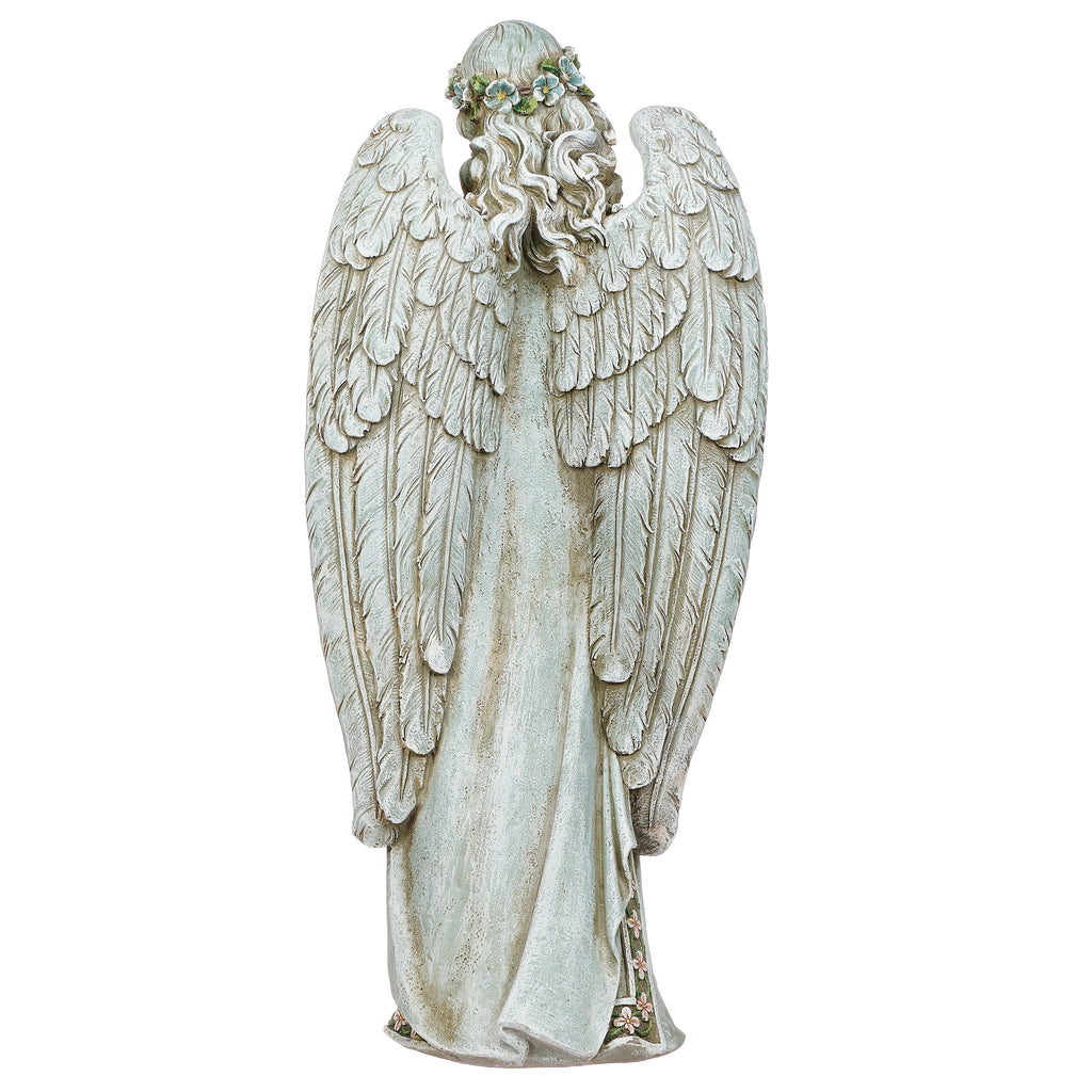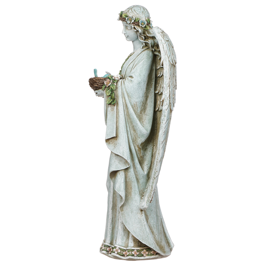 A gentle guardian of life and renewal, this angel radiates softness and grace. Cradling a sculpted bird's nest in her arms, she's adorned with floral detailing across her gown, neckline, and crown.
