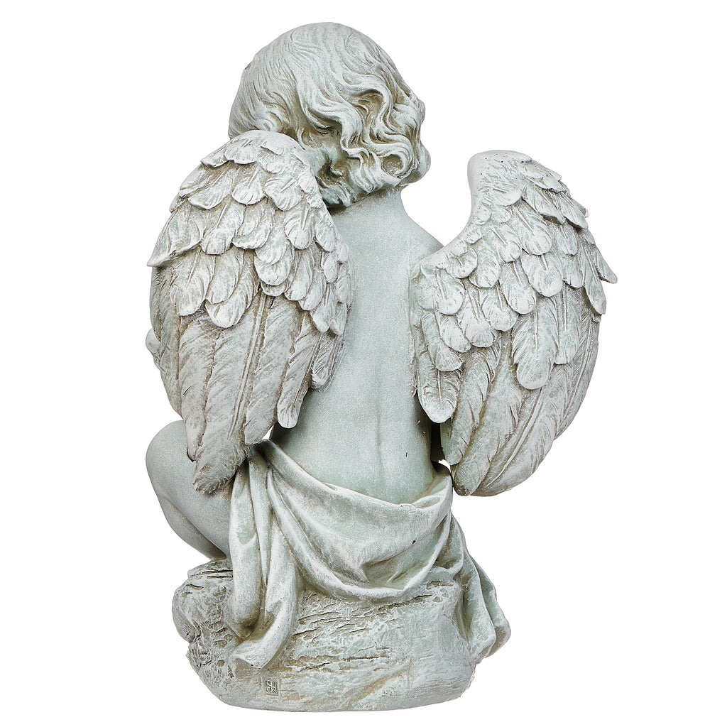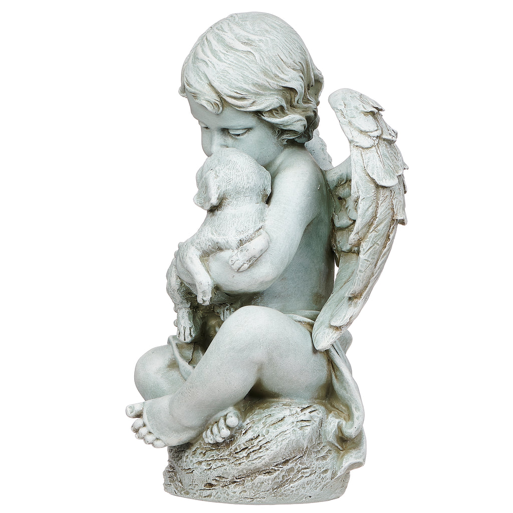 Sweetness meets serenity in this heartwarming statue of a cherub cradling a playful puppy. With soft, rounded features, feathered wings, and lifelike textures, the sculpture captures a tender moment of love and innocence.