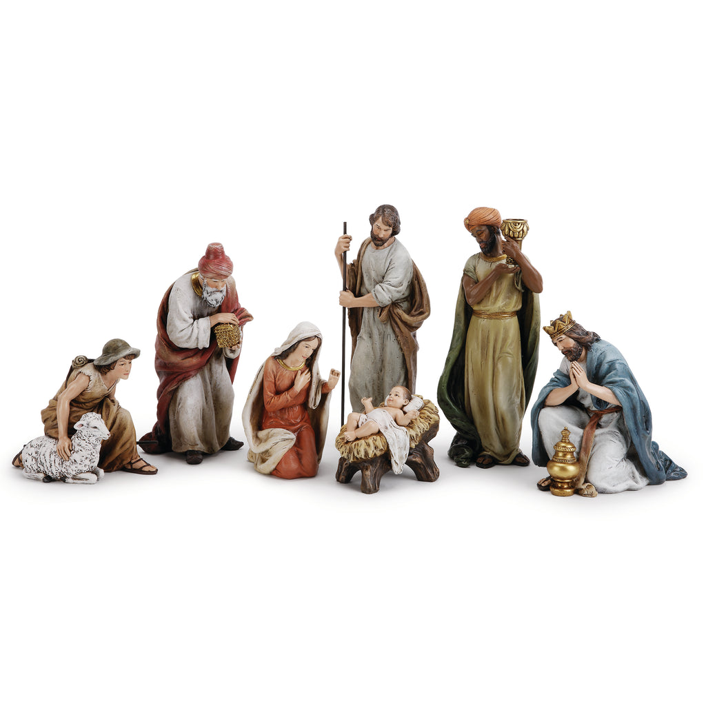 From the Joseph's Studio Collection, this 7-piece nativity set features beautifully detailed figures of Mary, Joseph, and Baby Jesus, joined by the Three Wise Men and a humble shepherd with his sheep. Rendered in warm, classic tones, this set brings the reverent story of Christmas to life in a display perfect for any setting.