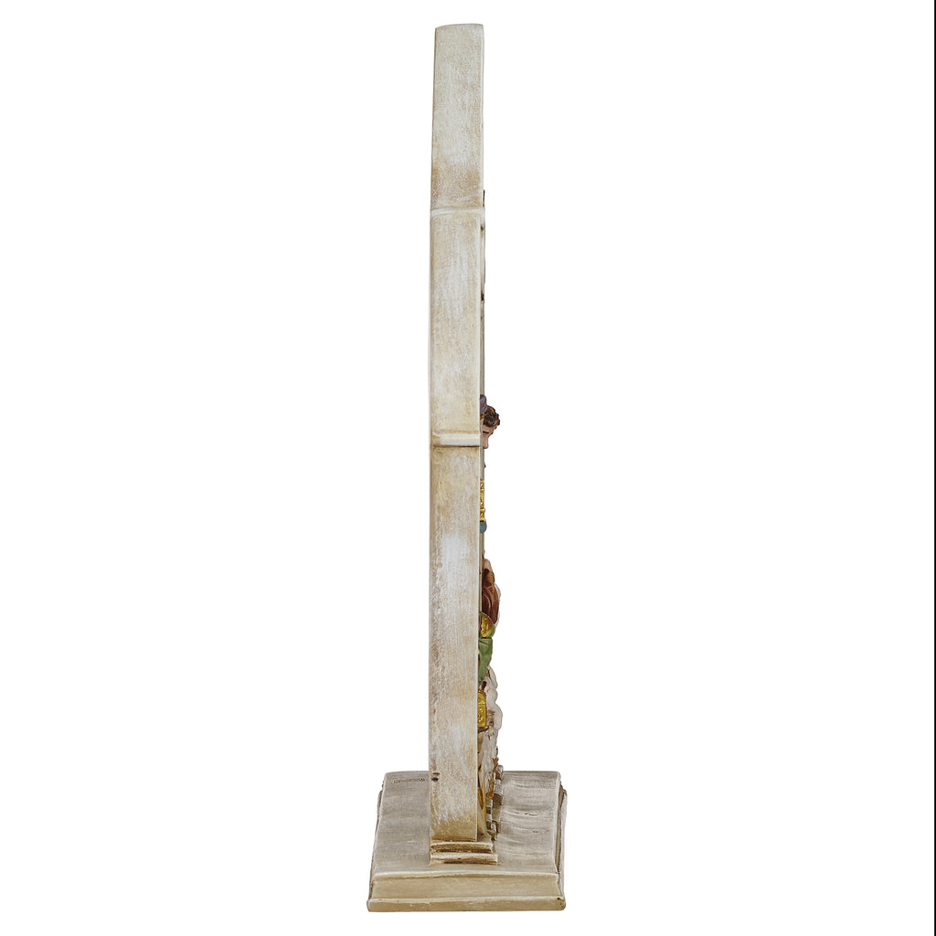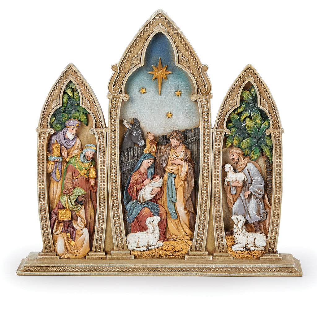 From the Joseph’s Studio Collection, celebrate the birth of Christ with this intricately designed Gothic Arch Nativity figure. Framed within three cathedral-style panels, the Holy Family is surrounded by the Magi, shepherds, and lambs beneath the Star of Bethlehem. Crafted from resin with ornate detailing and vibrant color, this piece brings reverence and beauty to your Christmas décor.