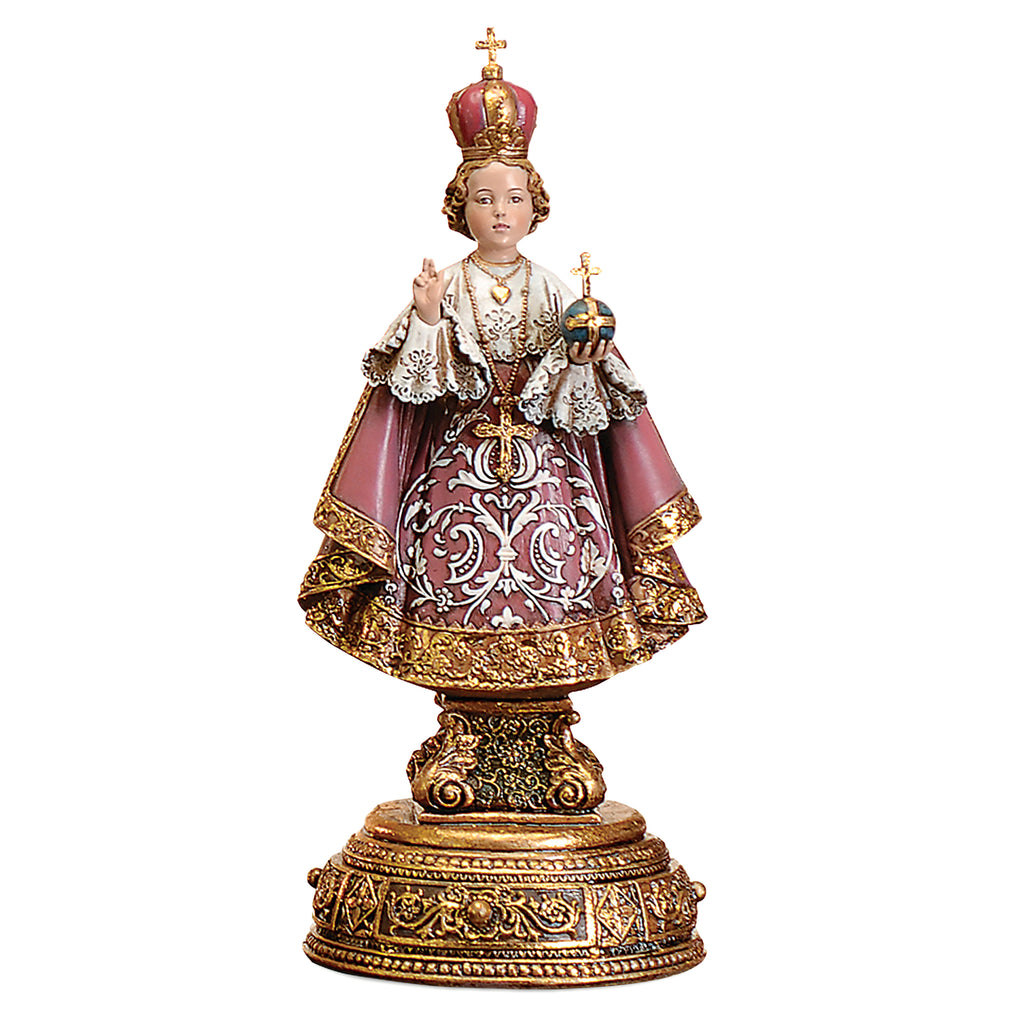 The Infant of Prague Figure is a stunning devotional statue symbolizing peace, protection, and divine care. Handcrafted from durable resin, it features remarkable detailing, from the ornate crown and flowing robes to the serene expression of the Christ Child. The decorative base includes a hidden drawer containing a scroll inscribed with the prayer: "Divine Infant Jesus, I know you love me and would never leave me. I thank you for your close presence in my life..." Perfect for altars, mantels, prayer spaces, or church displays, this statue combines elegant craftsmanship with a meaningful devotional touch, making it both a cherished keepsake and a thoughtful gift.