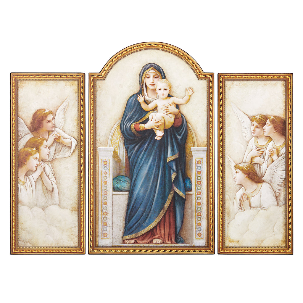 This Virgin Mary Triptych from Joseph’s Studio showcases a beautifully crafted central panel of the Blessed Mother, flanked by two side panels that highlight elegant artistry. Perfect for prayer corners, home altars, or chapels, it also makes a heartfelt gift symbolizing faith and devotion.