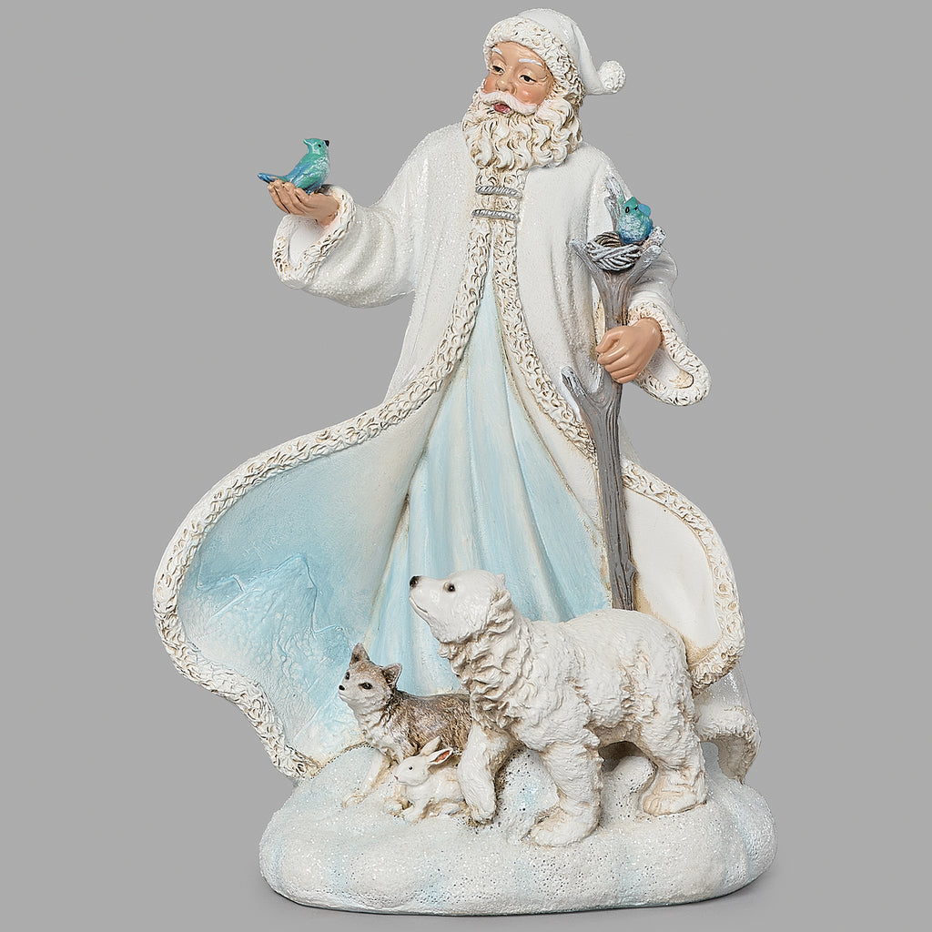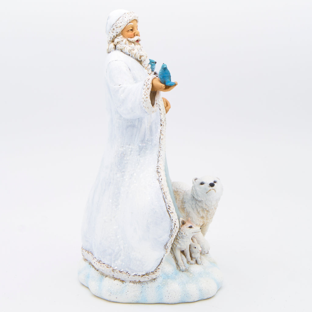 This beautifully detailed Santa figure features arctic animals gathered at his feet. With a white coat and gentle expression, it brings calm, wintry charm to mantels, shelves, or seasonal displays.