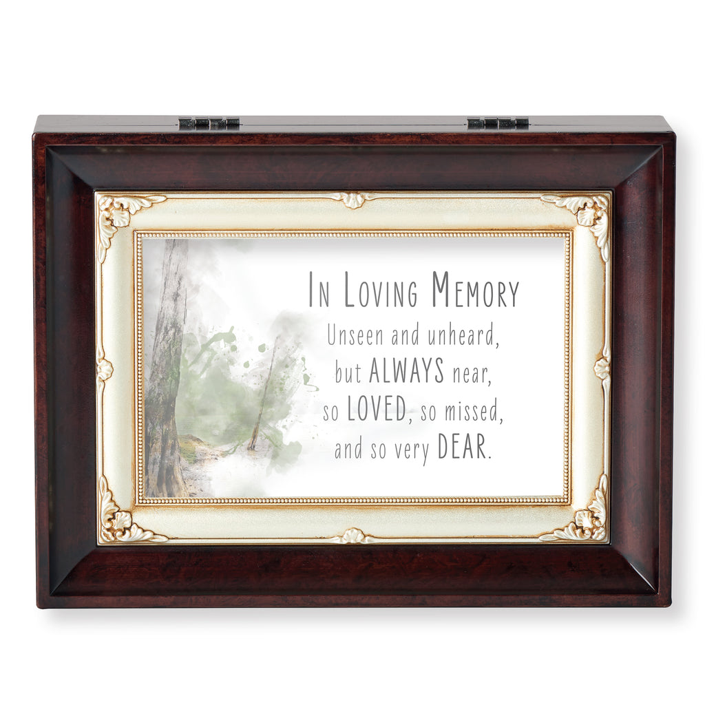 The In Loving Memory Keepsake Music Box offers a heartfelt way to honor someone special. Finished in a rich brown tone with timeless design details, this box is perfect for holding treasured items like photos, notes, or jewelry. With its classic wind-up mechanism, it provides a comforting reminder of love and remembrance. A touching tribute for home display or as a meaningful sympathy gift.