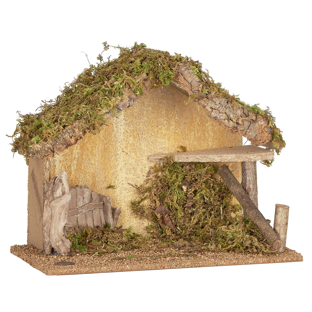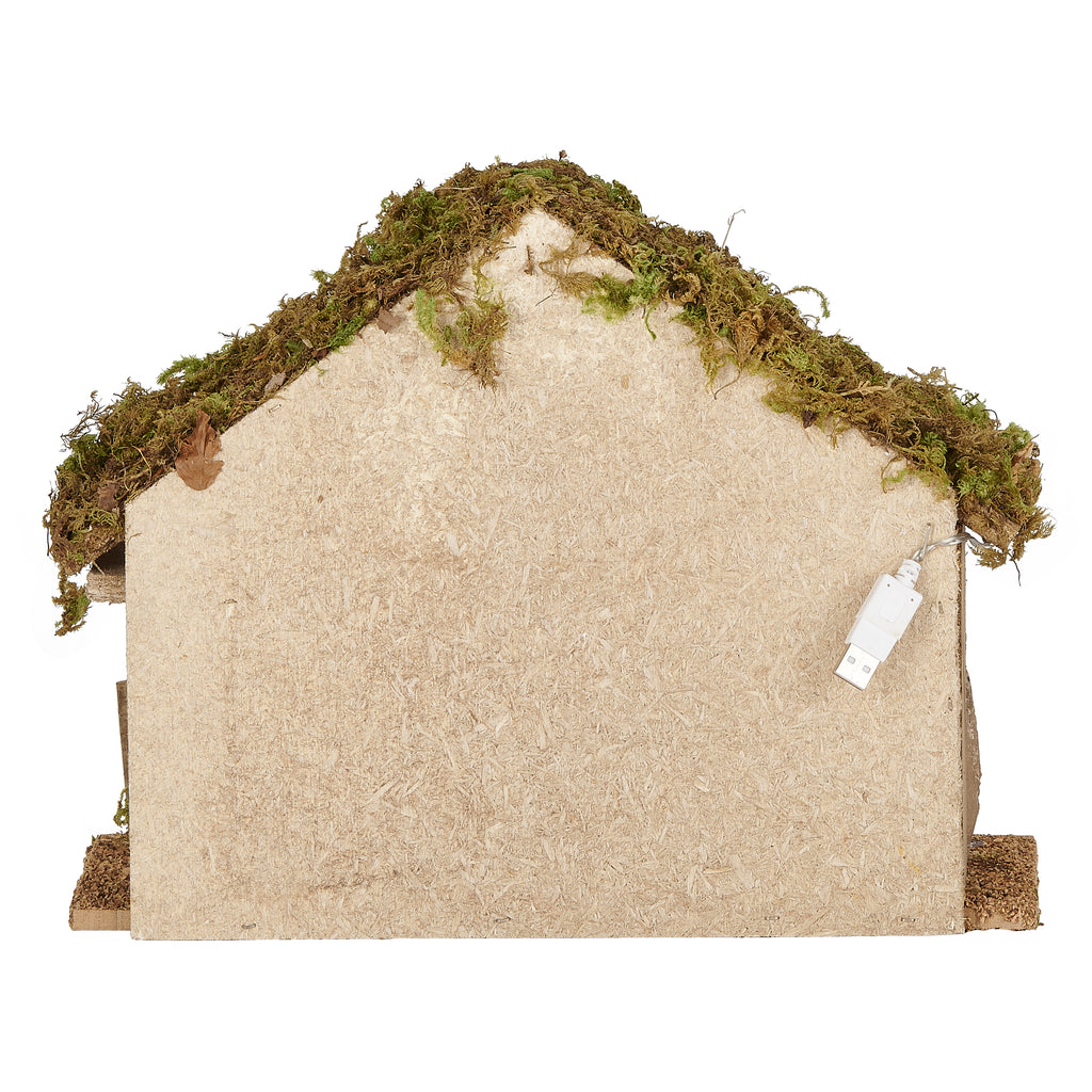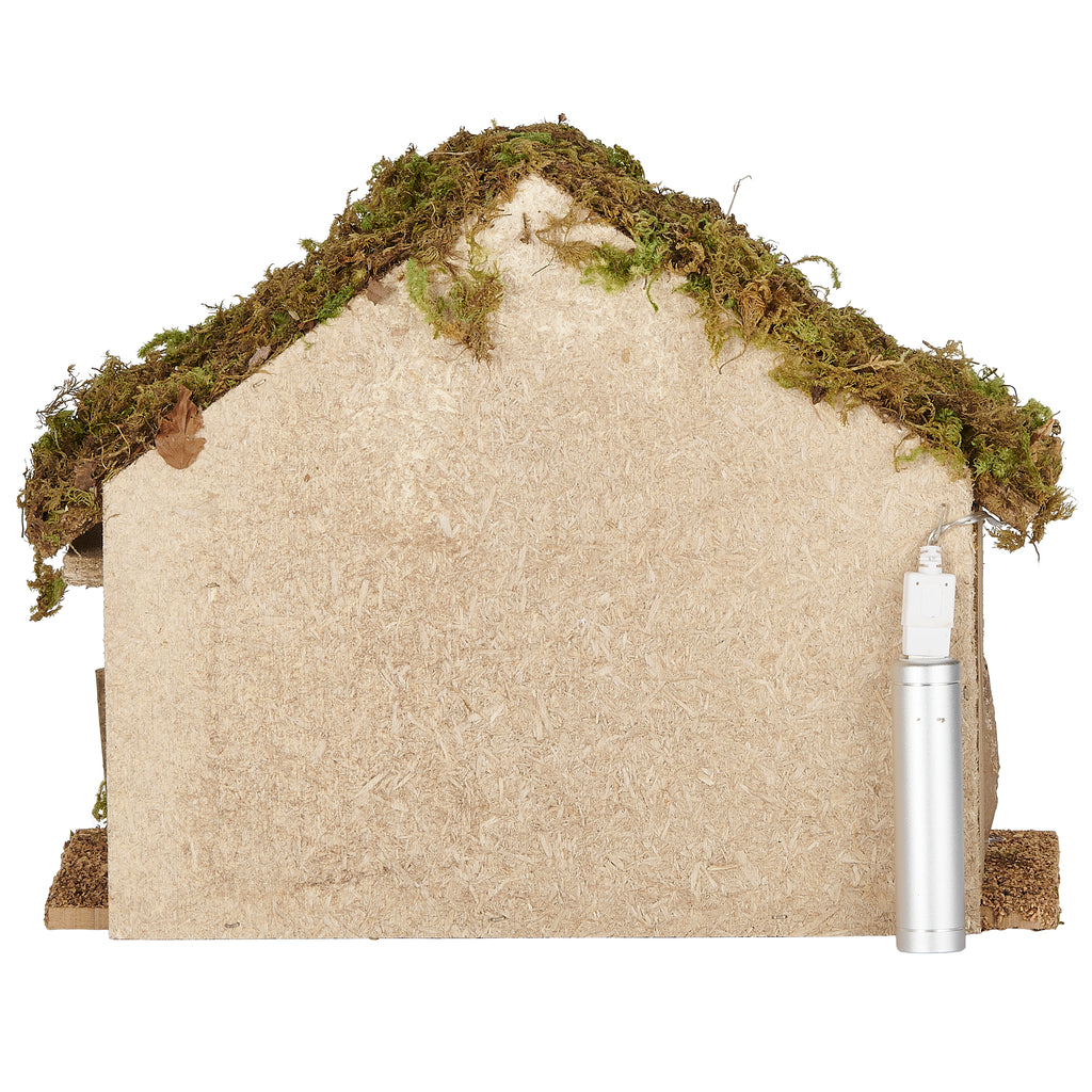 This beautifully lighted woodland stable captures the tranquil spirit of Bethlehem’s countryside. A warm golden glow fills the interior, highlighting the natural textures of bark, moss, and hand-laid wood beams. The sloped roof and rustic timber frame evoke the simplicity of the manger setting, while the weathered door and moss-covered roofline lend an authentic, timeworn charm. Perfectly designed to complement 5" scale Fontanini figures, this stable brings depth, warmth, and reverence to your Nativity display year after year.