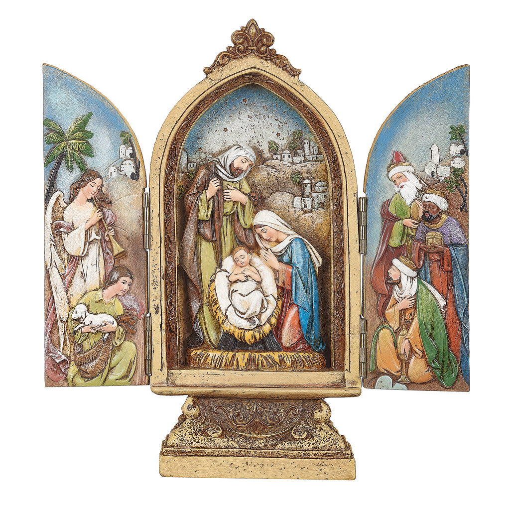 The Kings & Angels Nativity Triptych by Joseph’s Studio beautifully captures the reverence and wonder of that holy night. At the center, the Holy Family rests in peaceful devotion, while the side panels reveal graceful angels and the visiting Magi—each figure delicately sculpted and hand-painted with soft color and golden highlights. The hinged doors open to unveil a radiant, storybook-like scene framed in classic gold, evoking the spirit of sacred art and Christmas tradition.