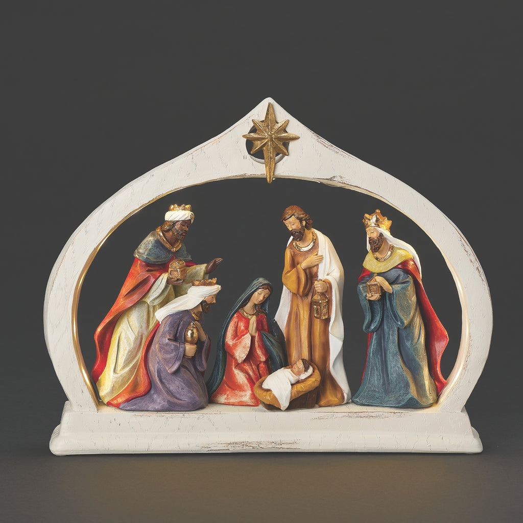 This nativity scene is framed within an illuminated arch crowned by the Star of Bethlehem, creating a radiant setting for the Holy Family. Mary kneels beside the Christ Child, Joseph stands nearby with a lantern in hand, and the Three Kings approach reverently in flowing, jewel-toned robes. The soft light from the arch adds a warm glow that highlights the sculpted details and enhances the sacred beauty of the moment. Blending traditional styling with a luminous touch, this piece offers a meaningful display of the Christmas story.
