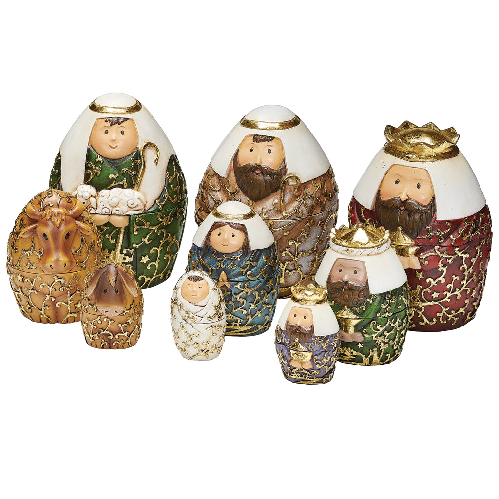Celebrate the season with this charming nativity nesting box set, finished in shimmering gold leaf and vibrant jewel tones. Each figure opens to reveal another, from the Holy Family and shepherds to the Three Kings and animals. A festive, compact way to display the full nativity story with warmth and whimsy.