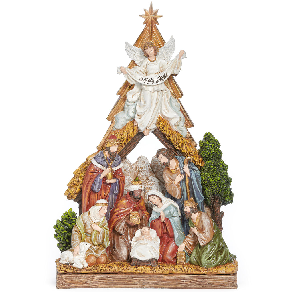 This nativity scene beautifully captures the wonder of Christmas, set beneath a tree shaped stable crowned with an angel holding a banner that reads O Holy Night. The Holy Family is surrounded by the Three Kings, shepherds, and animals, each crafted with rich detail and warm colors that bring the story of Christ’s birth to life. Standing tall and radiant, this piece makes a striking centerpiece and a meaningful reminder of the night the world was forever changed.