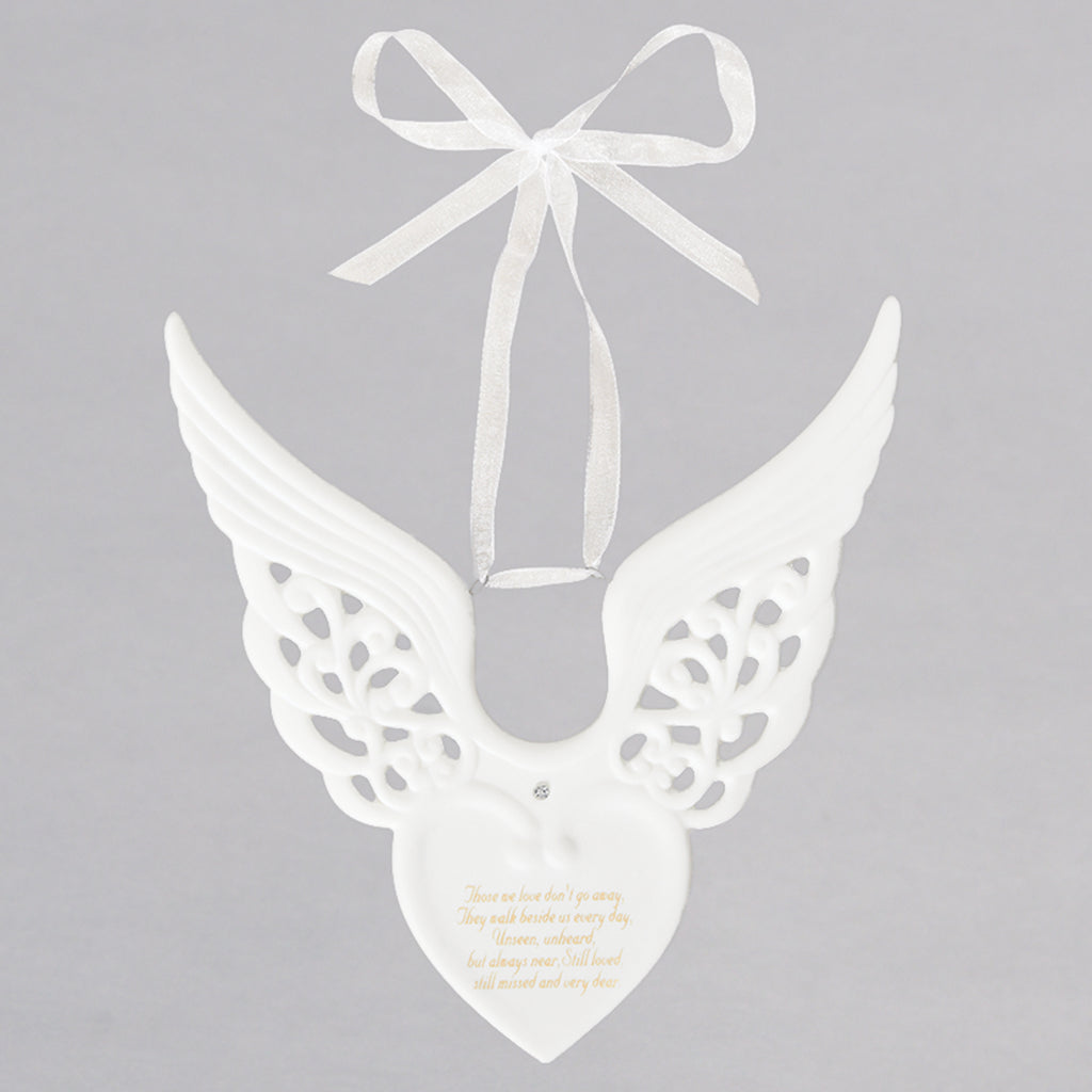 Keep the memory of those you love close with this porcelain ornament. Shaped like a heart with angel wings, it features the verse: "Those we love don't go away. They walk beside us every day. Unseen, unheard, but always near. Still loved, still missed, but ever dear". A meaningful keepsake for the holidays or year-round remembrance.