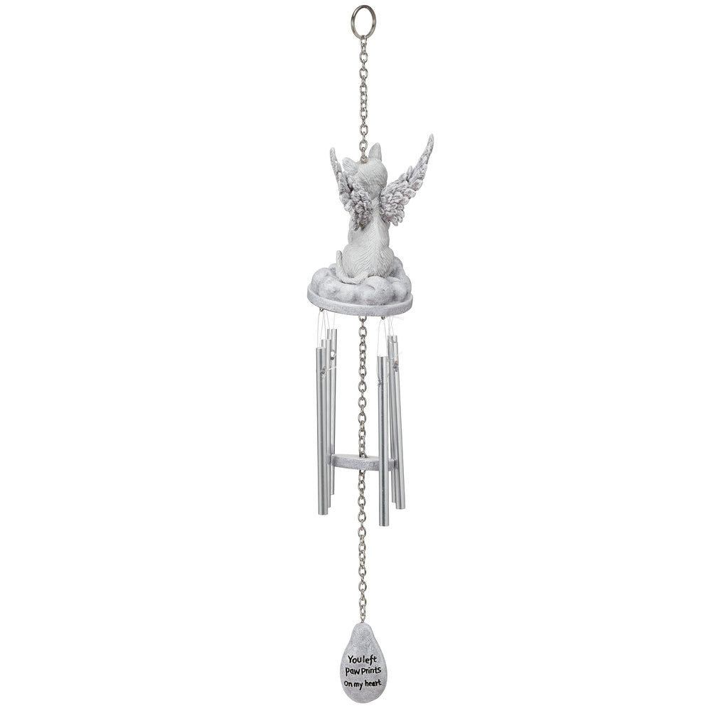 Honor the memory of a beloved pet with this touching cat memorial wind chime. A beautifully sculpted cat with angel wings sits above gently ringing chimes, while a dangling pawprint charm adds a meaningful finishing touch. The back of the charm is inscribed with “You left paw prints on my heart,” offering an extra layer of comfort and remembrance. Designed to bring peace and reflection, it’s a heartfelt tribute for gardens, patios, or pet memorial spaces.