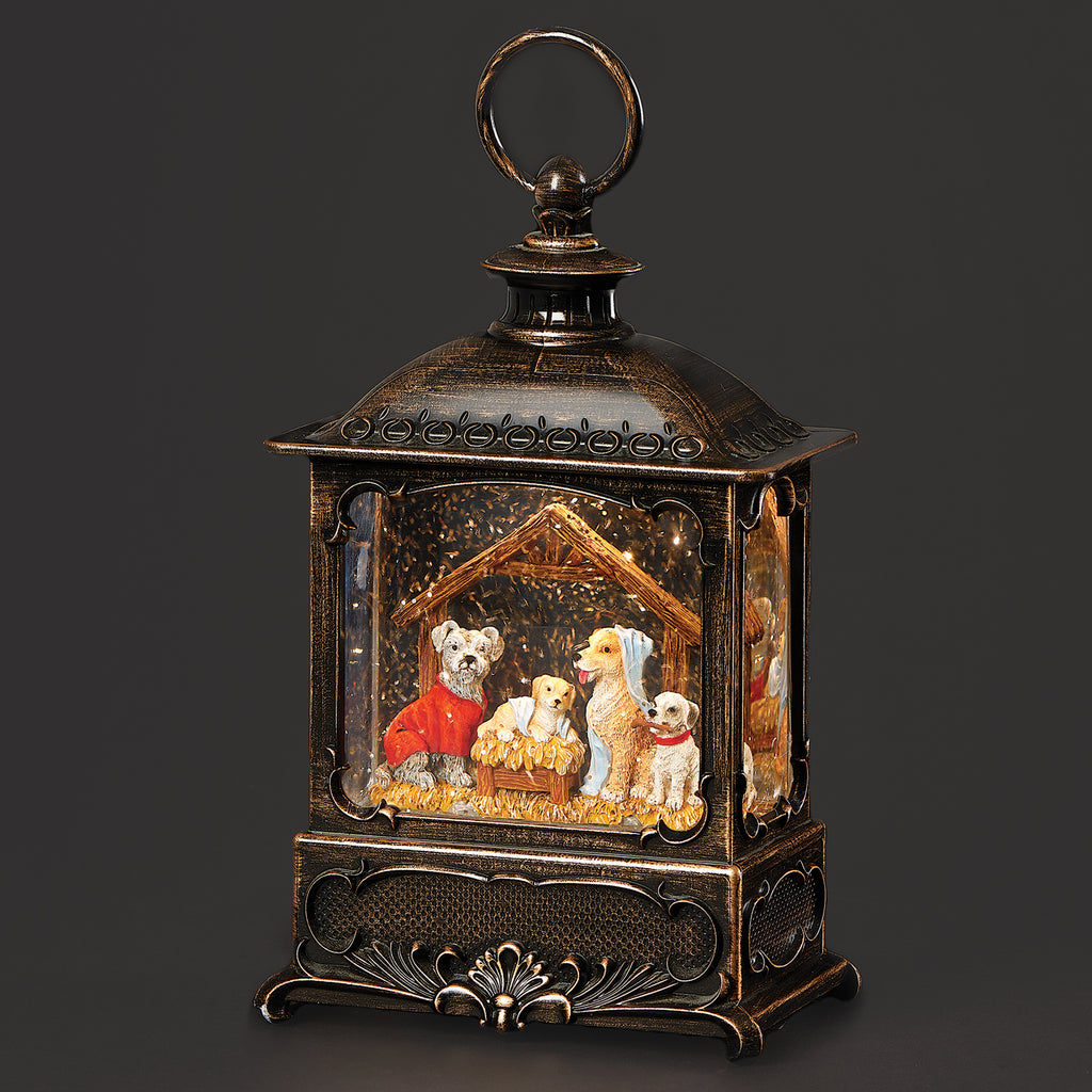 Celebrate the season with a playful twist in this lighted swirl lantern featuring a canine holy family. Swirling glitter and soft illumination bring this heartwarming and whimsical holiday scene to life.