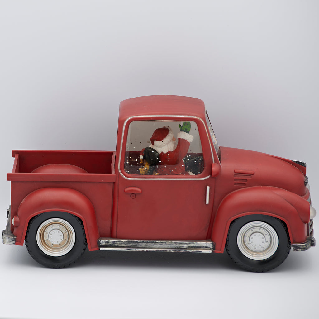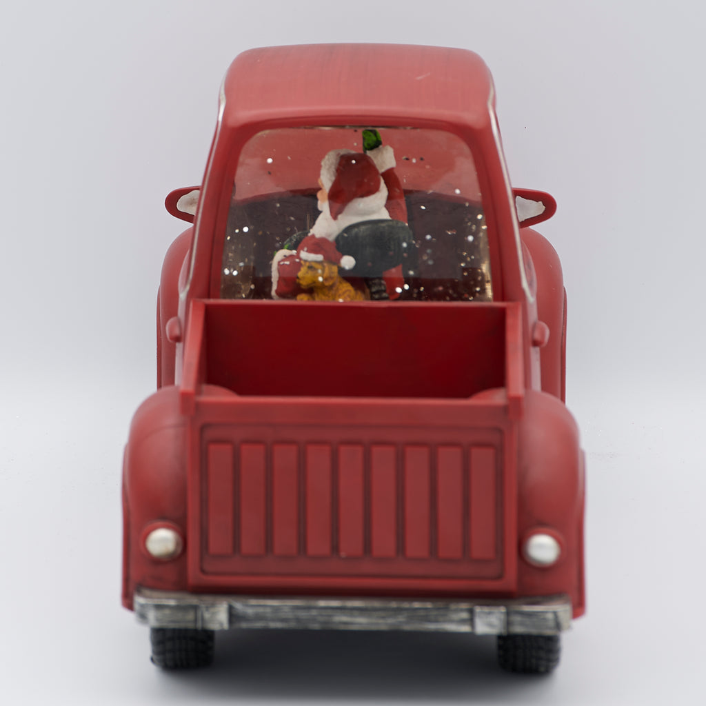Celebrate the season with this festive lighted swirl red truck. Santa rides alongside an adorable puppy as swirling glitter sparkles in the glow of warm lights. A heartwarming holiday scene, it’s the perfect accent for mantels, shelves, or tabletops and makes a delightful gift for pet lovers and Christmas collectors.