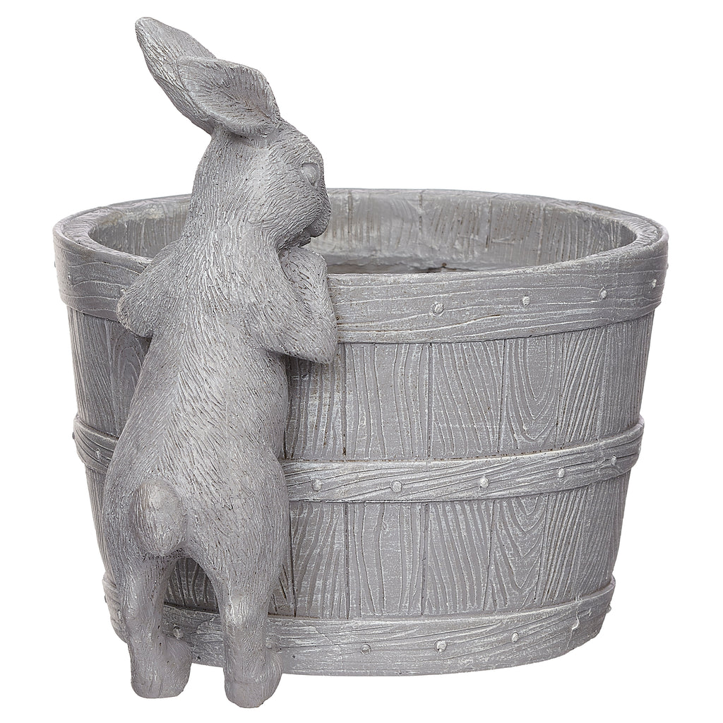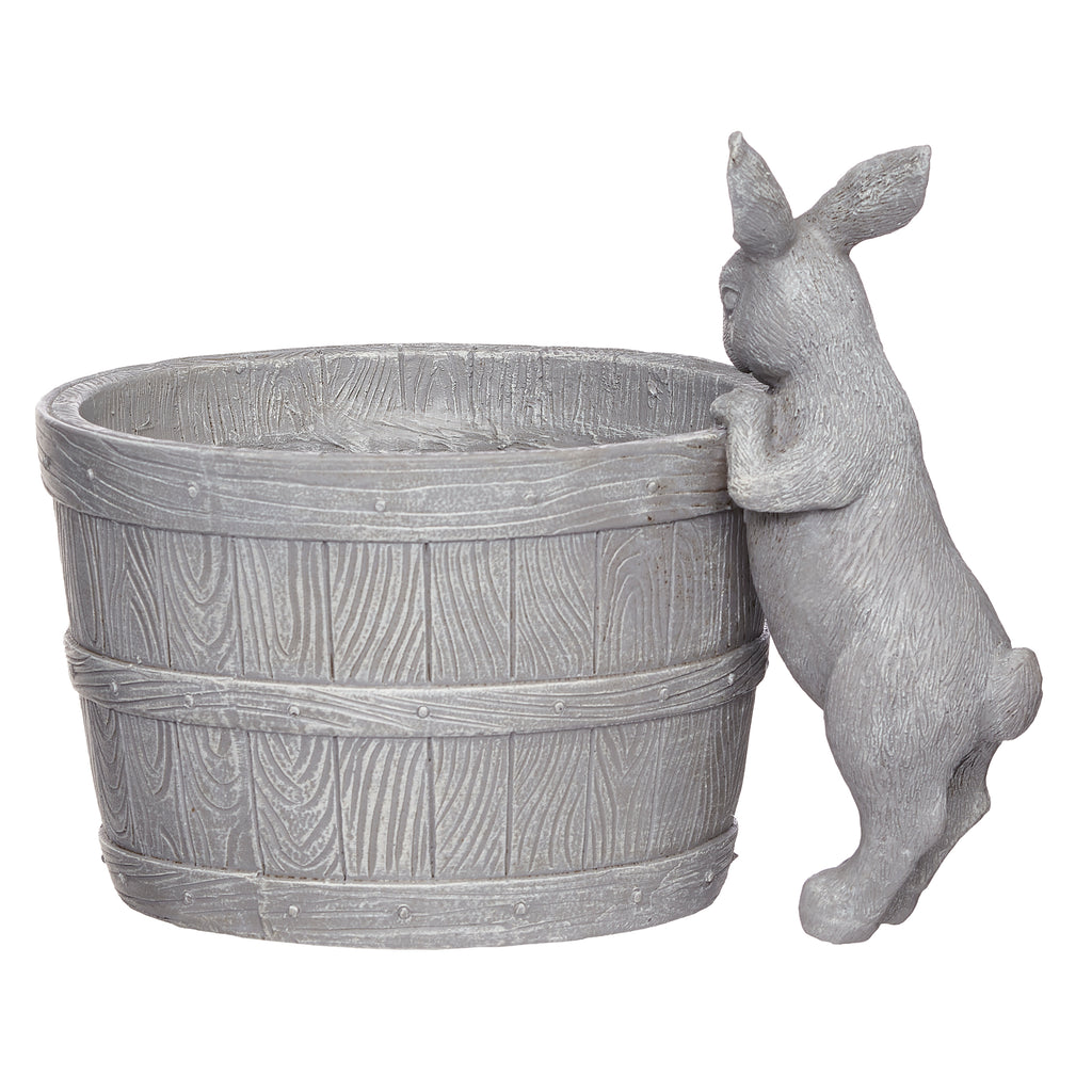 Add a touch of whimsy to your home or garden with this charming planter. A curious bunny stands on tiptoe to peek into a rustic faux-wood bucket, creating a delightful scene that’s perfect for displaying small plants, succulents, or herbs. Whether placed on a porch, nestled in a garden bed, or brightening a windowsill, this piece makes a sweet gift for garden lovers and bunny fans alike.