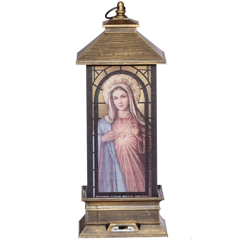 This elegant lantern features a beautifully detailed image of the Immaculate Heart of Mary, symbolizing peace and devotion. When illuminated, it casts a soft, warm glow that creates a serene atmosphere for prayer, reflection, or meditation. Perfect for altars, home shrines, or as a thoughtful devotional gift.