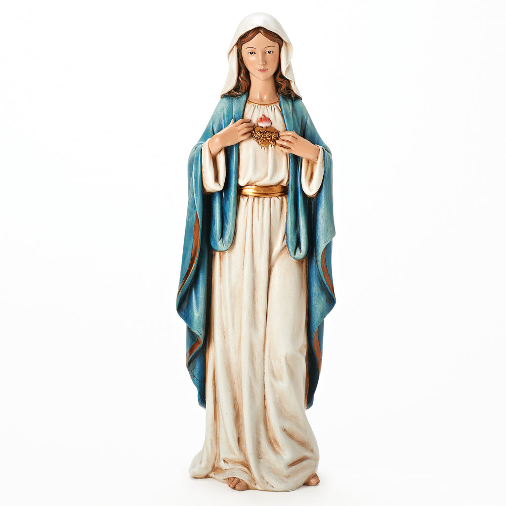 This finely crafted statue of the Immaculate Heart of Mary captures delicate detail and quiet reverence. Depicted with hands gently pointing to her radiant heart, it reflects her love, purity, and maternal care. A meaningful addition to a home altar, prayer space, or devotional corner, this statue brings a serene and sacred presence to any spiritual setting.