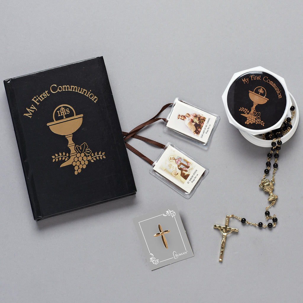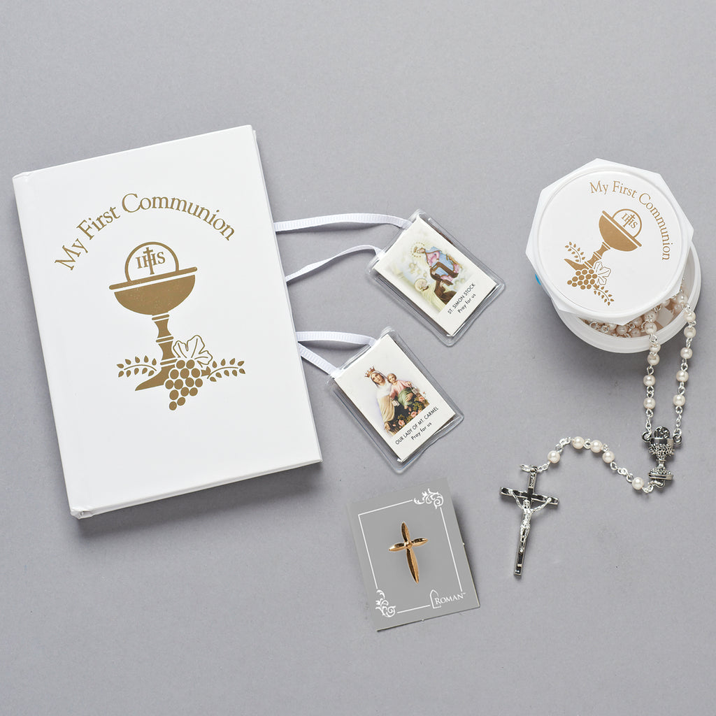 Celebrate a child’s First Communion with this complete set designed to inspire prayer and remembrance. Available in either black or white, each set includes a beautifully bound prayer book with gold-stamped chalice artwork, a rosary presented in a matching keepsake box, a gold cross lapel pin, and a traditional scapular with devotional images. Together, these meaningful pieces offer both spiritual guidance and lasting keepsakes, making this a thoughtful gift to mark one of the most important milestones in a child’s faith journey.