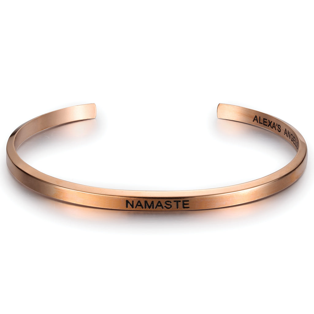 A symbol of peace and mindfulness, this "Namaste" bracelet reminds us of the sacred in every soul. Available in silver, gold, and rose gold, its sleek, adjustable fit makes it perfect for daily wear or meaningful gifting.