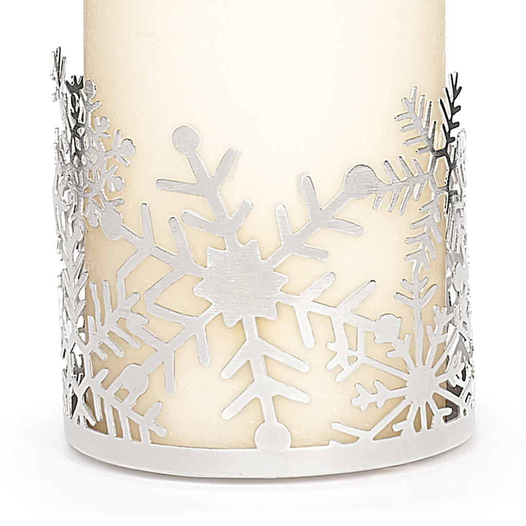 This silver snowflake candle wrap brings a seasonal sparkle to your home decor. Featuring delicately cut snowflake designs and a shimmering metallic finish, it wraps around most standard pillar candles to create a cozy, wintery atmosphere. Lightweight and reusable, it's ideal for holiday decorating, centerpieces, or thoughtful hostess gifts.