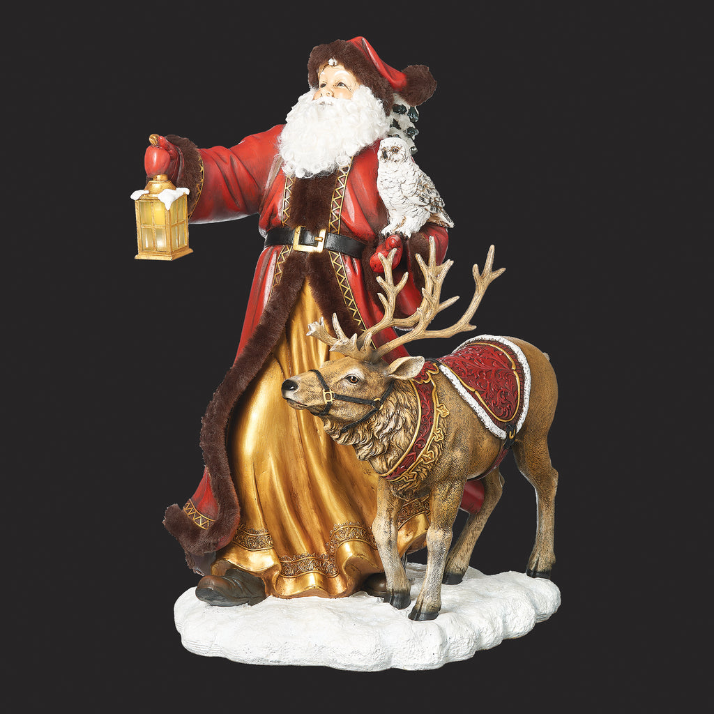 This festive statue captures Santa leading the way with a glowing lantern, accompanied by a reindeer dressed in red and gold and a snowy owl perched at his side. His fur-trimmed robe and golden gown are rich with holiday detail, while the lifelike reindeer and watchful owl add charm and character to the scene. With its intricate design and seasonal warmth, this piece is a standout decoration that brings the magic of Christmas to your display year after year.