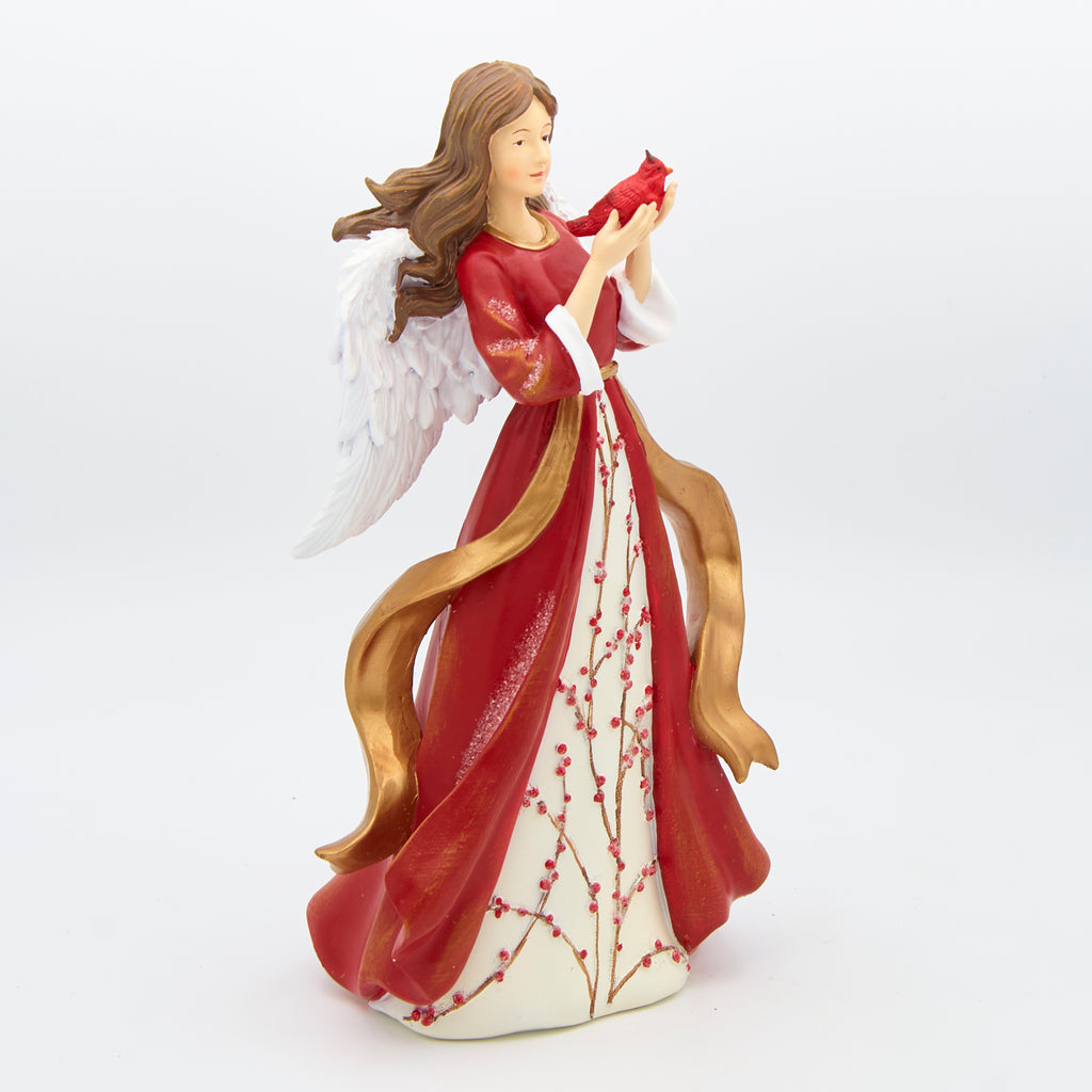 Grace your holiday decor with this angel figure, dressed in berry-accented robes and adorned with flowing gold ribbon. Holding a red cardinal close, she symbolizes peace, love, and spiritual comfort, making her a meaningful centerpiece for the season.