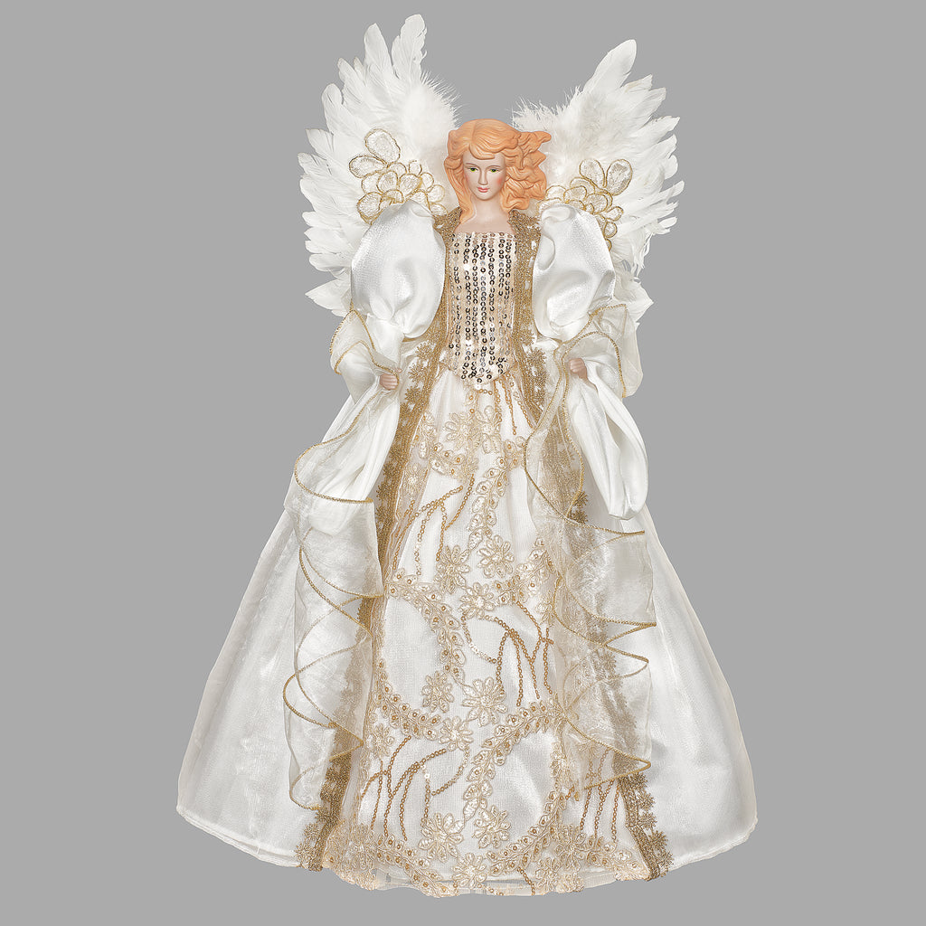 Add timeless elegance to your Christmas tree with this 16" angel treetopper. Dressed in flowing ivory lace and adorned with beautifully crafted feather wings, she brings a serene and graceful presence to your holiday display. Made from soft fabric with fine details, this treetopper blends tradition and elegance for any décor style.