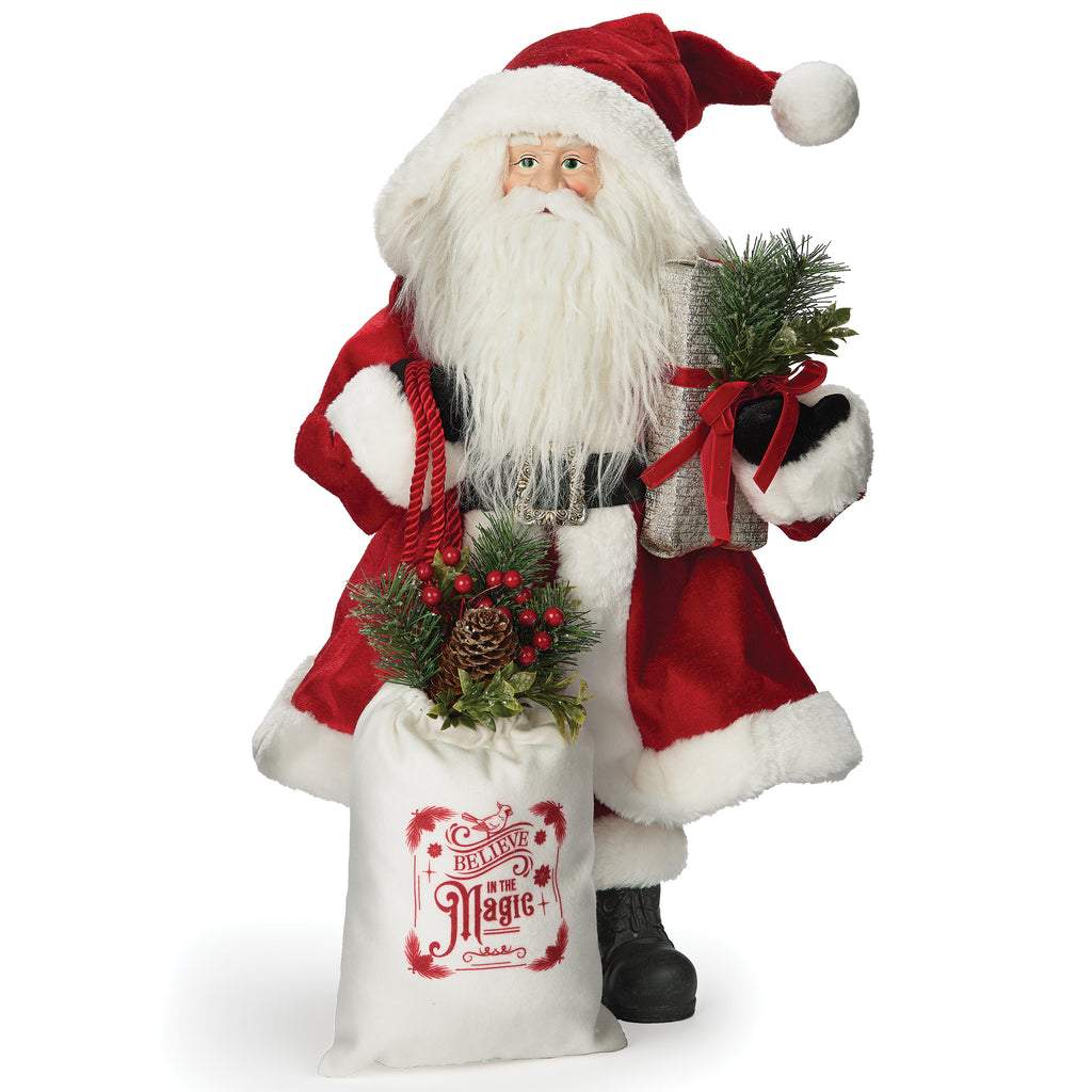 Add timeless holiday charm with this Santa figure dressed in his classic red coat and hat. Crafted from festive fabric, Santa carries a “Believe in the Magic” bag filled with greenery, pinecones, and gifts, bringing warmth and cheer to your seasonal décor. Perfect for mantels, tabletops, or entryway displays.