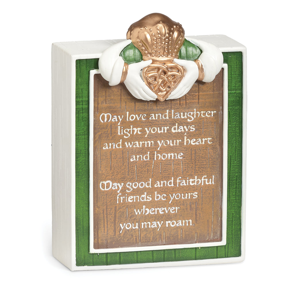 This beautifully designed tabletop plaque features the timeless Claddagh, a symbol of love, loyalty, and friendship. Accented with a rustic woodcut-style finish and bordered in green, it brings warmth and meaning to any room. Perfect for celebrating Irish heritage or gifting to loved ones.