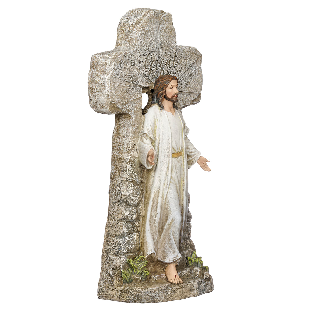 Celebrate the miracle of the Resurrection with this powerful Jesus Rising figure. Depicted stepping forward from the stone tomb with arms open in glory, the Risen Christ stands before a cross inscribed with the beloved hymn verse, “How Great Thou Art.” The stone-textured design and lifelike artistry create a timeless reminder of God’s power, grace, and everlasting love. A meaningful addition to Easter displays, gardens, or year-round devotional spaces.