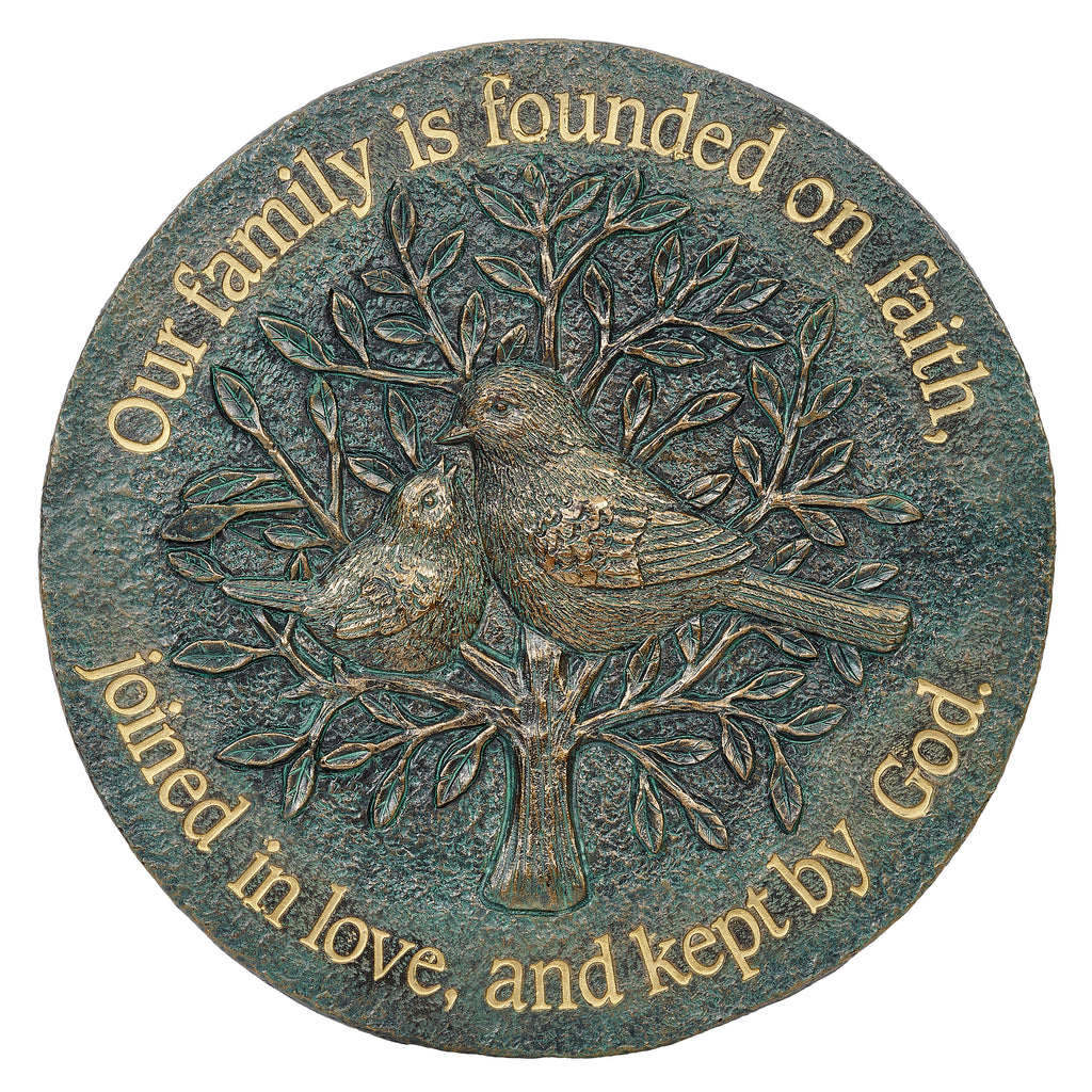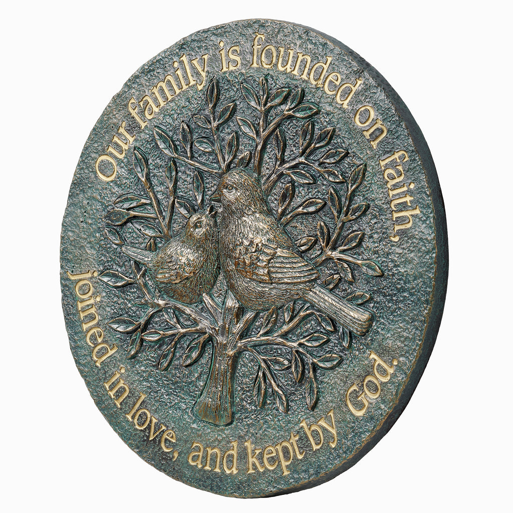 Celebrate faith and togetherness with the Family Faith Garden Stone. Featuring two birds perched on a leafy branch, this decorative stone carries the heartfelt message: “Our family is founded on faith, joined in love, and kept by God.” Finished in bronze with a soft blue patina, it adds beauty and meaning to walkways, patios, or garden beds. A thoughtful gift for loved ones, it serves as a lasting reminder of family unity and blessings.