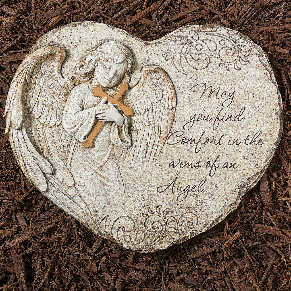 This Memorial Angel Stepping Stone offers a peaceful tribute to a loved one. Featuring a beautifully sculpted angel and the heartfelt inscription: "May you find comfort in the arms of an angel" it brings serenity and remembrance to any garden, pathway, or outdoor space.
