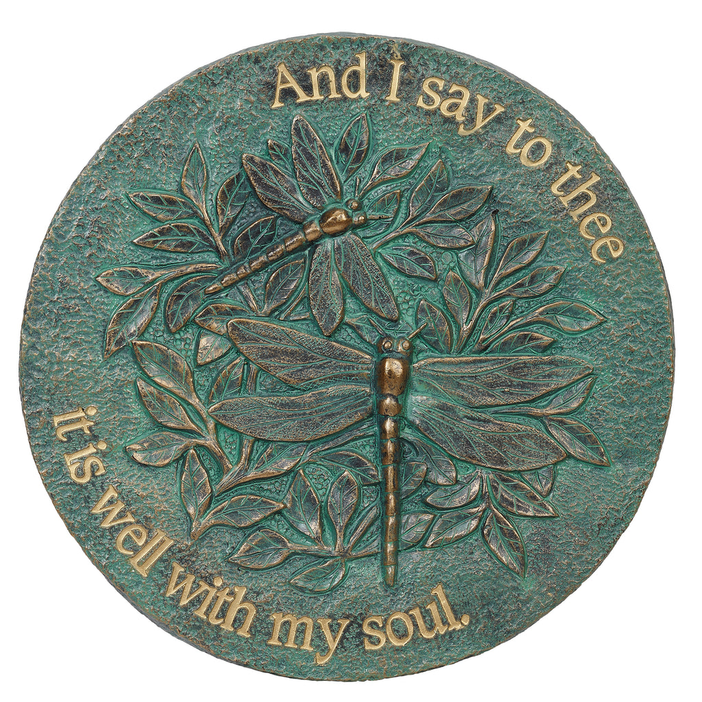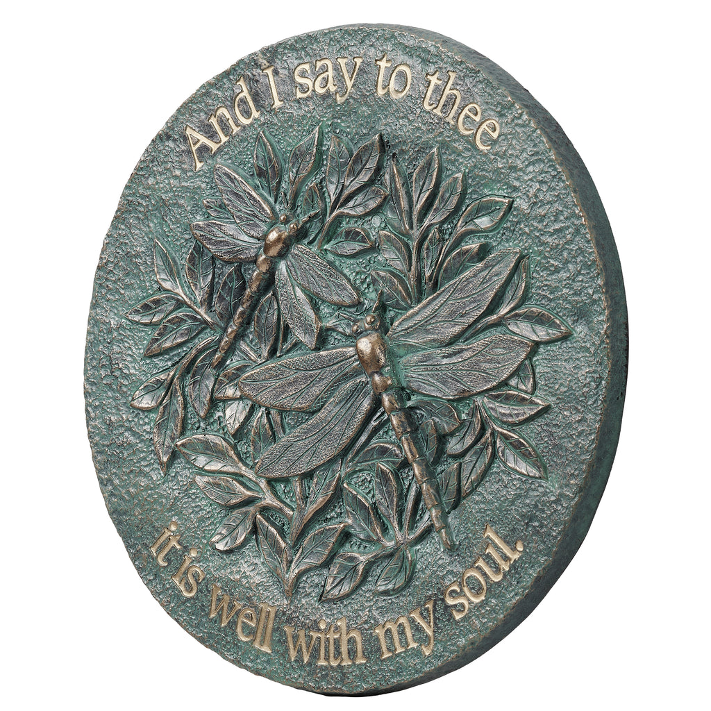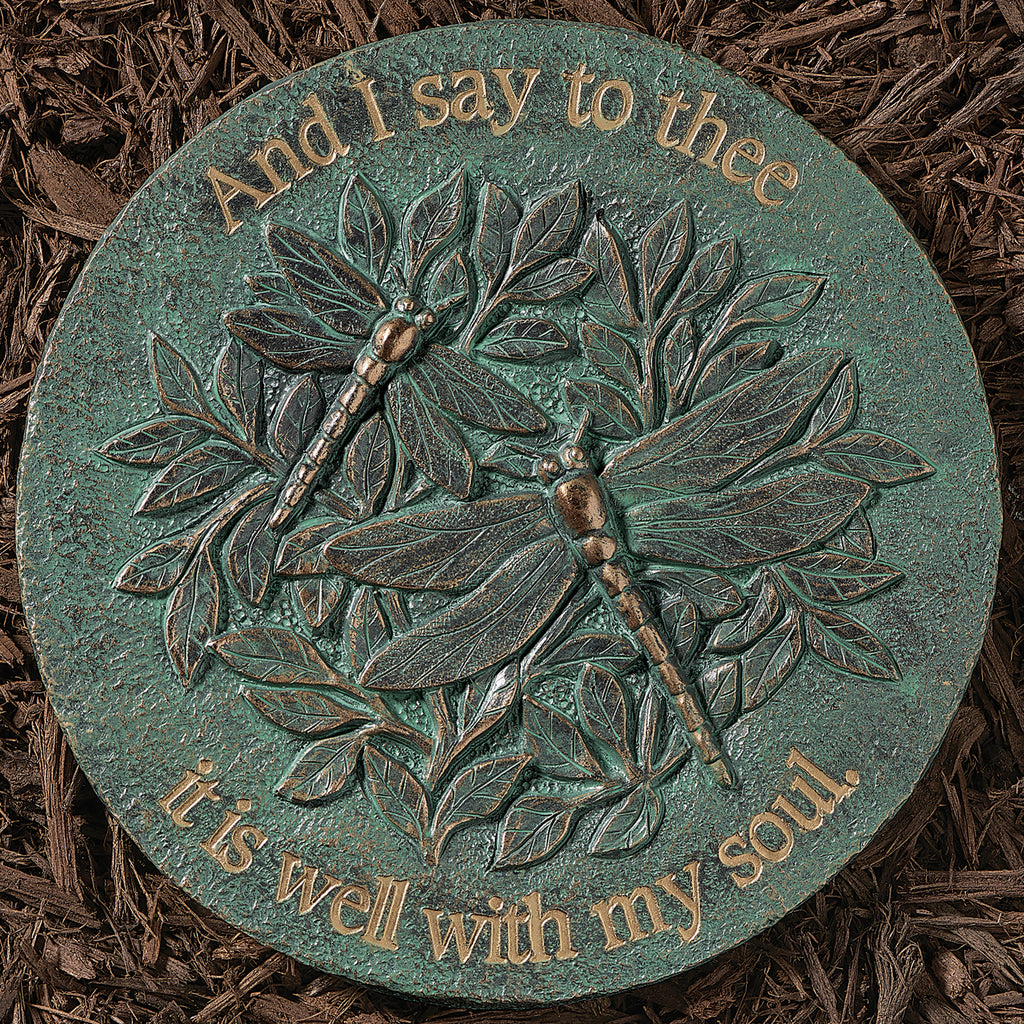 Bring serenity and inspiration to your outdoor space with the Dragonfly “It Is Well With My Soul” Garden Stone. Featuring two detailed dragonflies surrounded by leafy branches, this piece is finished in a rich bronze and blue patina that enhances its intricate design. The comforting inscription offers a meaningful reminder of peace and faith, making it a perfect accent for garden beds, walkways, or patios. It also makes a heartfelt gift for loved ones.