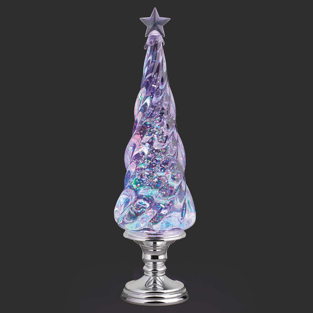 A stunning twist swirl tree with a silver pedestal and star topper. Filled with swirling glitter and confetti lites, it brings festive brilliance to mantels and tabletops.
