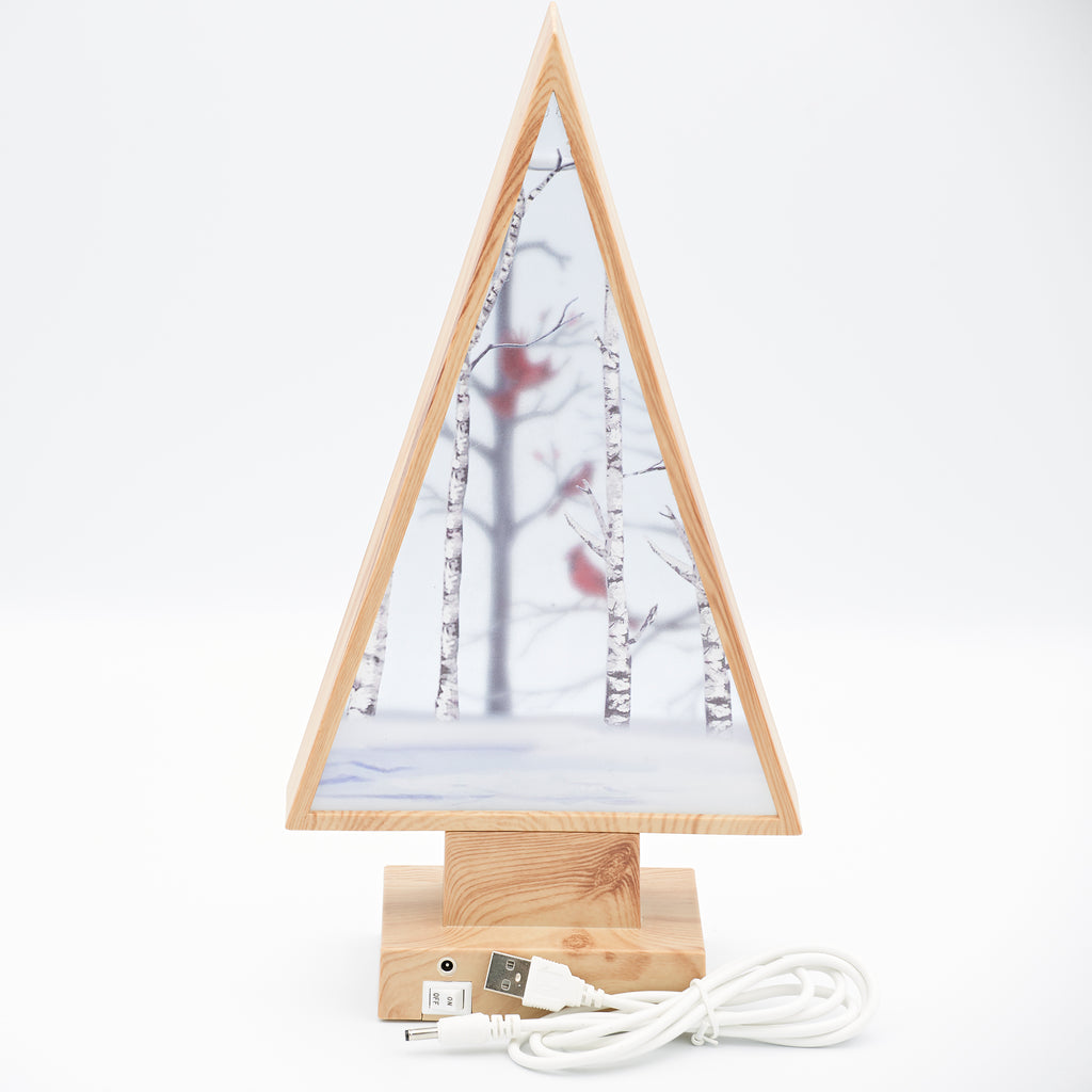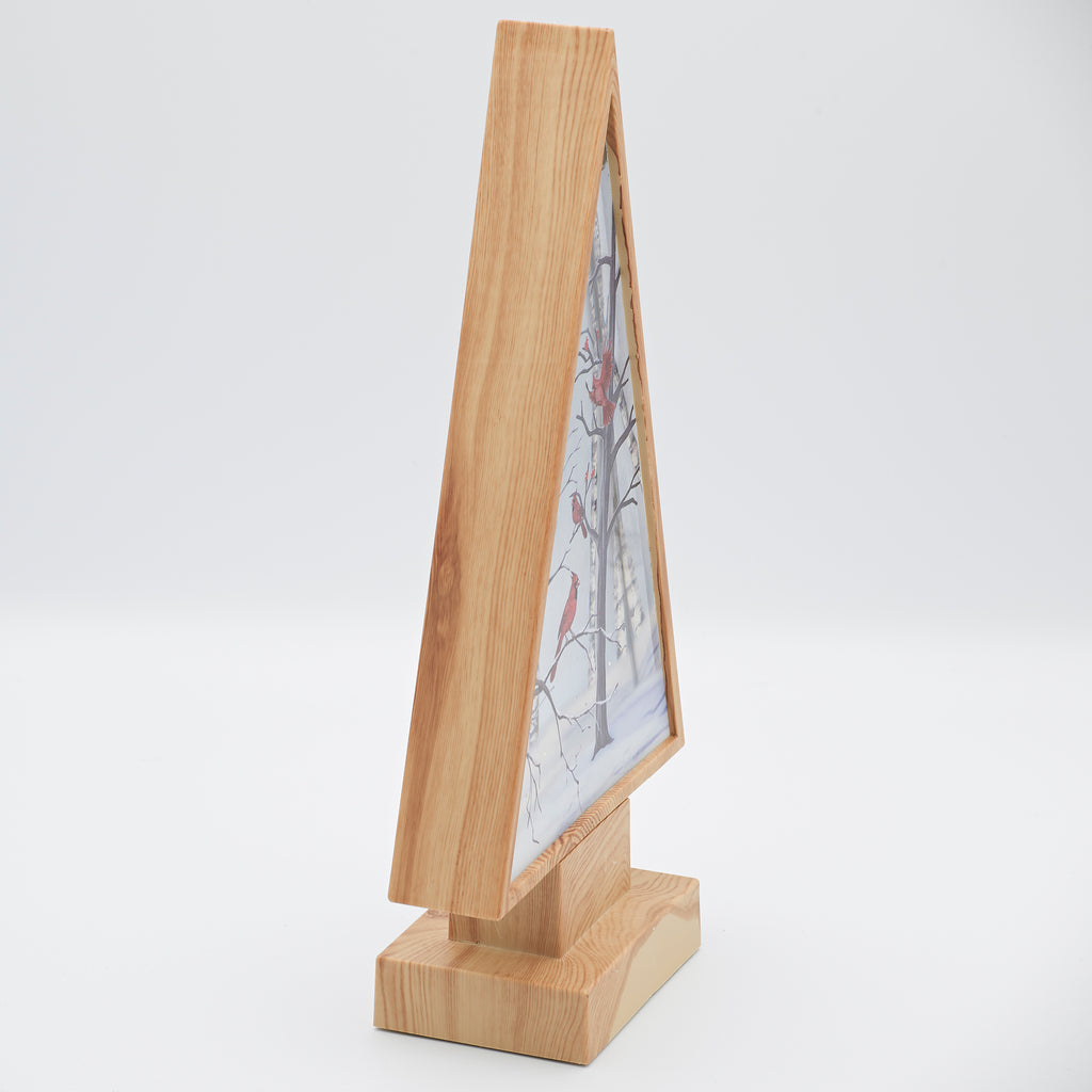 This lighted swirl wood-style tree features a beautifully printed cardinal scene. Swirling glitter and warm light bring this rustic woodland display to life, perfect for cozy holiday decorating.