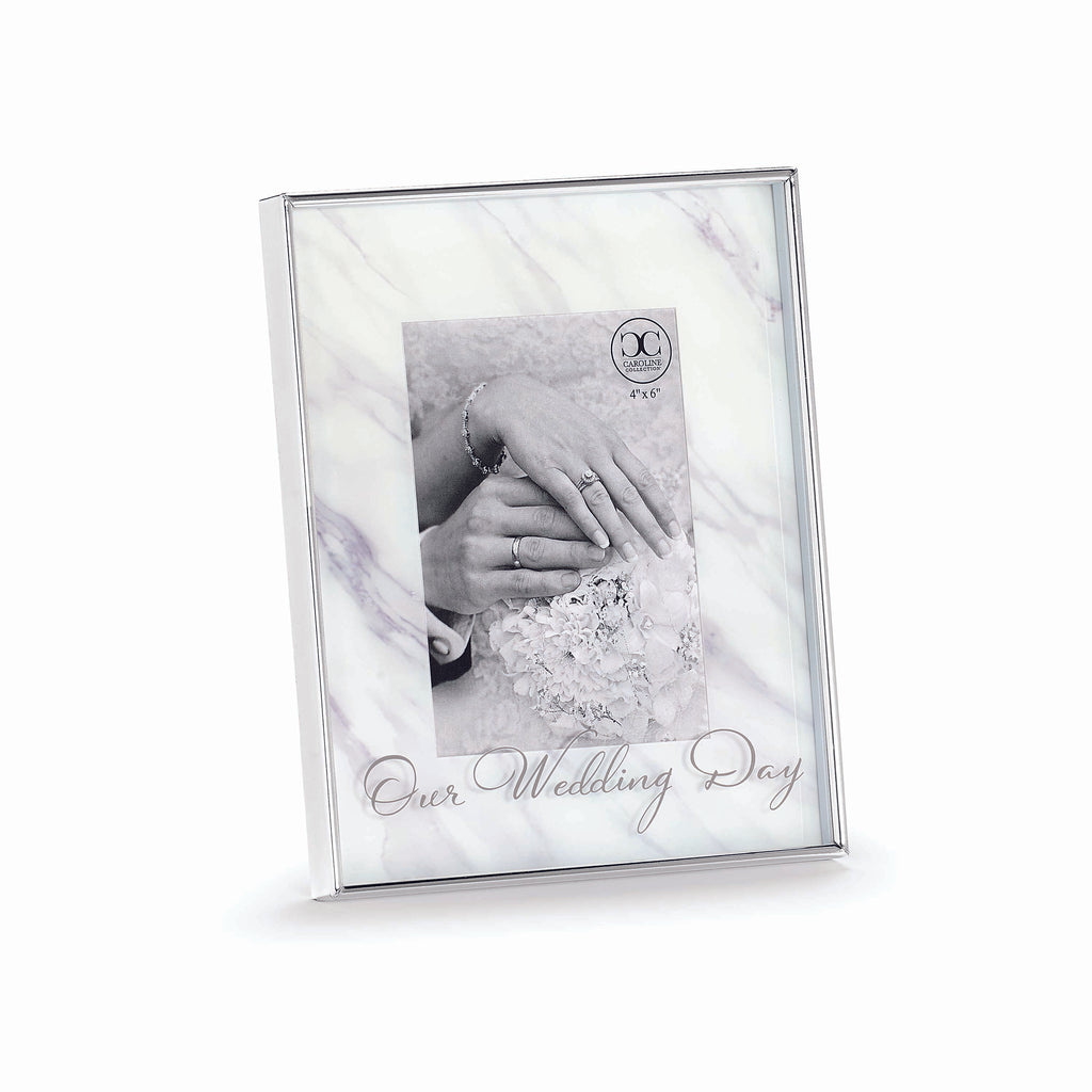 Celebrate a cherished wedding memory with this elegant Caroline Collection Wedding Marble Floating Frame. Featuring a soft marble-look backdrop with sleek metal edging, this floating-style frame beautifully showcases a favorite photo while adding a refined touch to any space. The sentiment “Our Wedding Day” displayed on the front makes it a meaningful keepsake for weddings, anniversaries, or special moments of love.