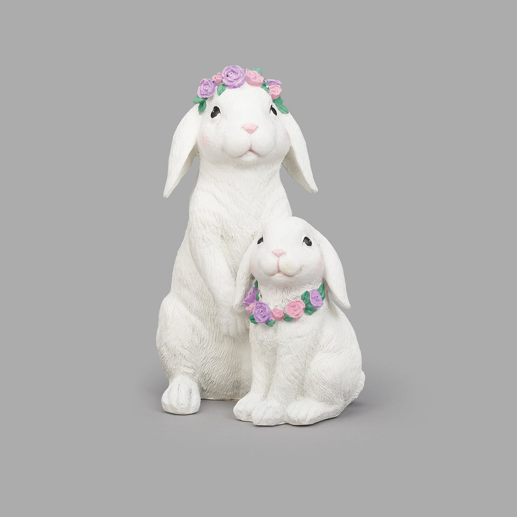 Bring a touch of springtime charm to your décor with this delightful Bunnies Figure with Flower Crown and Necklace. Featuring two sweet bunnies posed together, one adorned with a colorful flower crown, the other a delicate necklace, this figure captures the joy and freshness of the season.