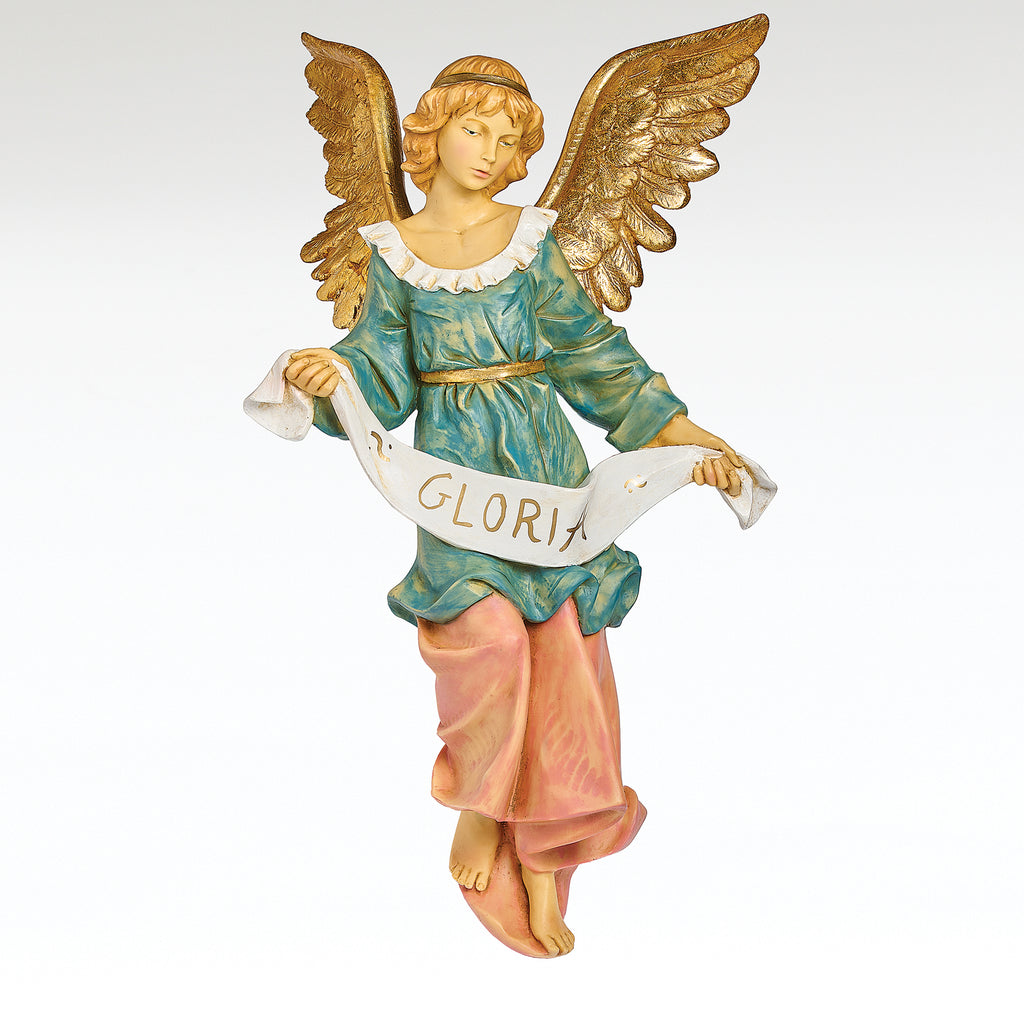 The Gloria Angel soars with elegance, carrying the heavenly proclamation of Christ’s birth. With outstretched banner reading “Gloria”, she recalls the angels’ joyous message to the shepherds on that holy night: “Glory to God in the highest, and on earth peace.” Her golden wings radiate brilliance, while her flowing robes in teal and rose bring color and grace to the nativity display