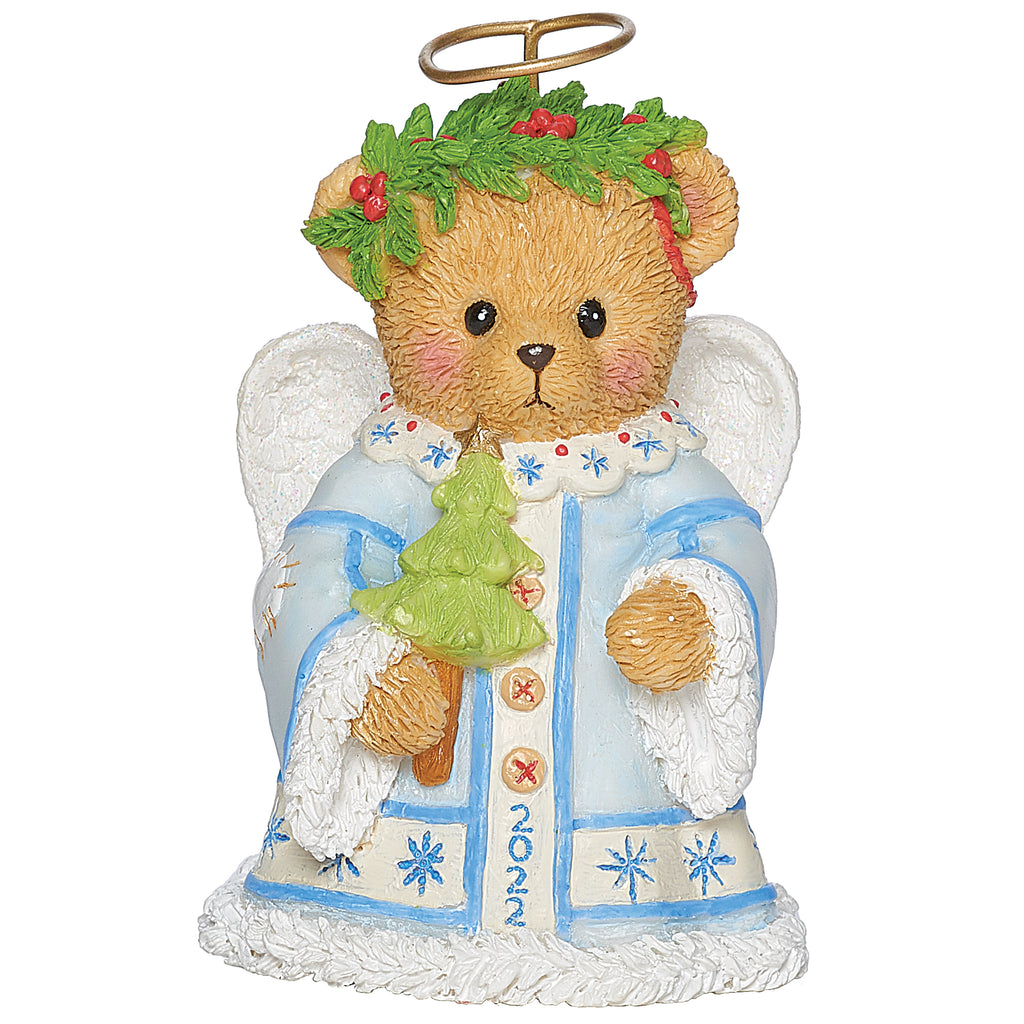 Add a heavenly touch to your holiday tree with the Angel Bear Bell Ornament dated 2022 from Cherished Teddies. This ornament features a sweet bear dressed in a snowy blue robe with angel wings, a golden halo, and festive wreath crown, holding a decorated Christmas tree.