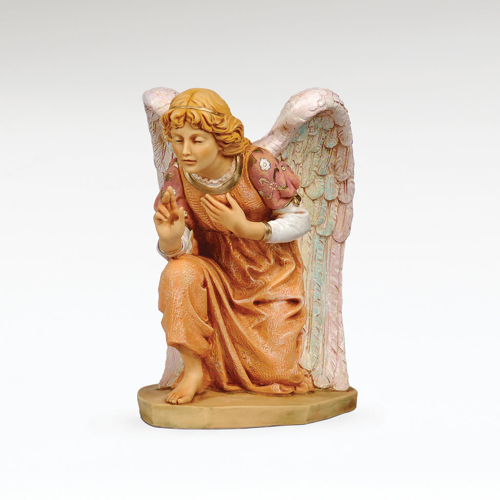 This Kneeling Angel from embodies devotion and reverence at the heart of the Nativity. With one hand lifted in blessing and the other placed humbly across the chest, the angel’s graceful pose captures a moment of quiet worship before the Newborn King. The soft flowing robes, textured wings, and hand-painted detailing reflect Fontanini’s artistry, bringing both elegance and sacred meaning to your display.