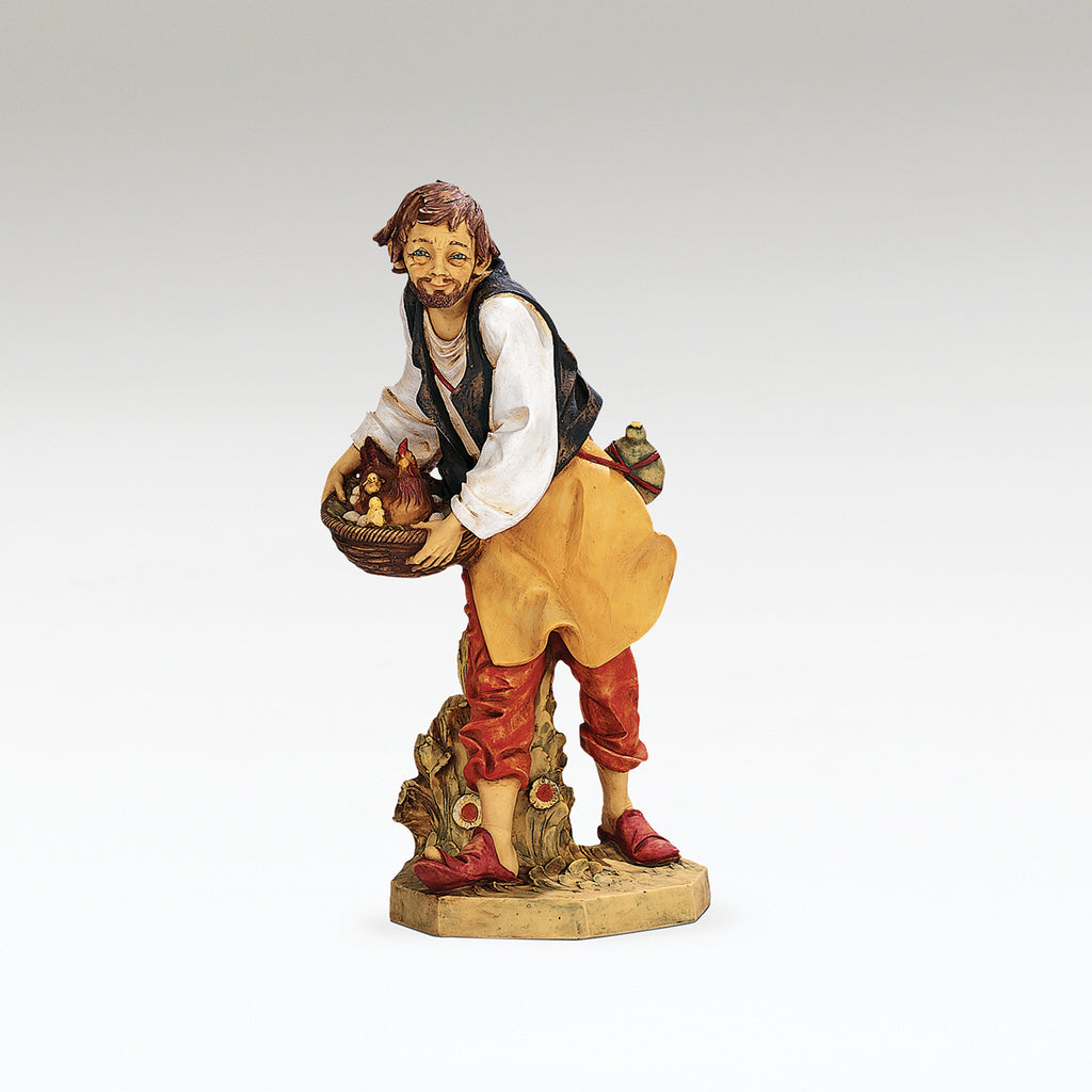 Lucas, the cheerful shepherd, is shown carrying a basket of hens, a reminder that every gift—no matter how humble—has value before the newborn King. His lively expression and practical garb of rolled sleeves, crimson trousers, and sturdy vest reveal the hardworking joy of daily life in Bethlehem. With his cloak draped over one shoulder, Lucas provides a serene focal point, inviting reflection in large nativity displays for home or church.