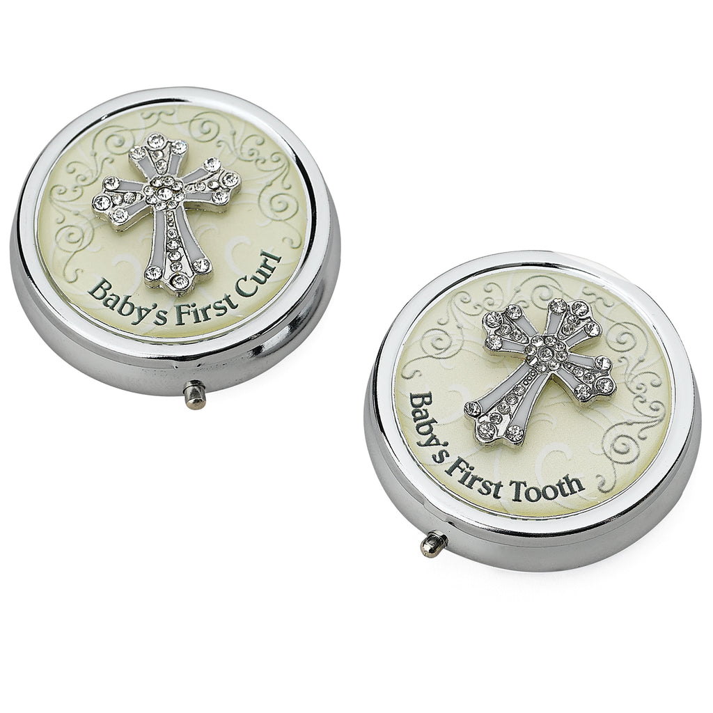 Celebrate the milestones that mark your baby’s earliest days with this elegant 2-piece keepsake box set. One box is labeled for a first tooth, the other for a first curl—each designed to safely hold and preserve those tiny treasures. Accented with sparkling cross embellishments and a soft, neutral finish, these keepsake boxes are both practical and meaningful. A thoughtful gift for baptisms, baby showers, or new parents, they make a lovely addition to a nursery shelf or memory chest, cherishing every little first.