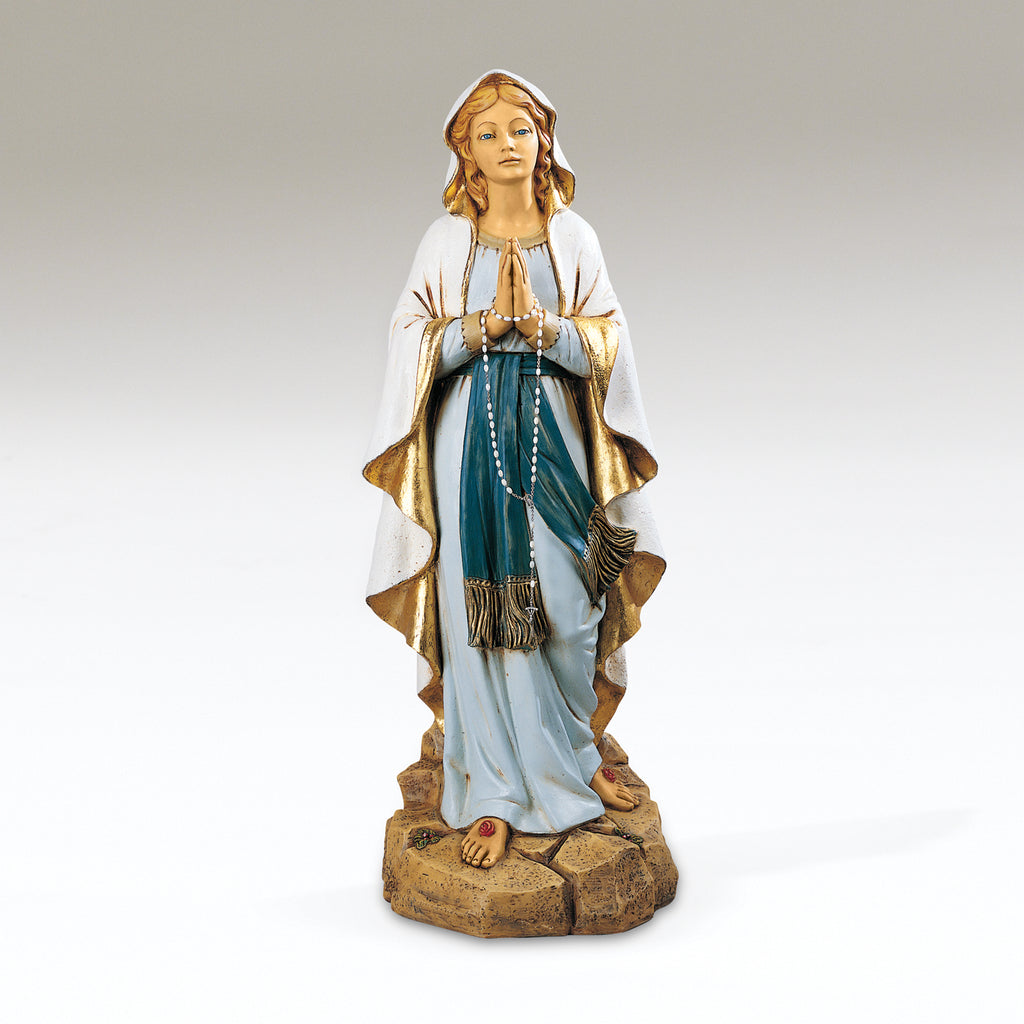 This magnificent statue of Our Lady of Lourdes beautifully depicts Mary in pure white with delicate golden trim. Her hands are reverently clasped in prayer, with a rosary gracefully draped across her arms. Designed with profound natural detail and serene grace, this statue inspires deep contemplation and faith, bringing a sacred presence to any devotional space.