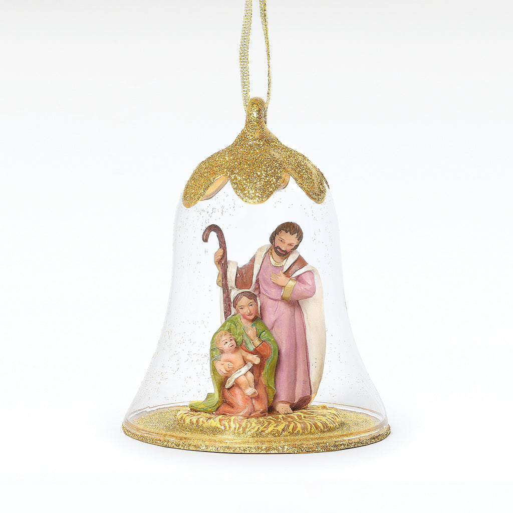 This ornament presents the Holy Family inside a clear bell-shaped dome, accented with a gold glittered top and base. The finely detailed figures of Mary, Joseph, and the Infant are crafted with Fontanini’s signature artistry, making this piece both visually striking and meaningful. A ribbon hanger completes the design, allowing it to display beautifully on any Christmas tree.