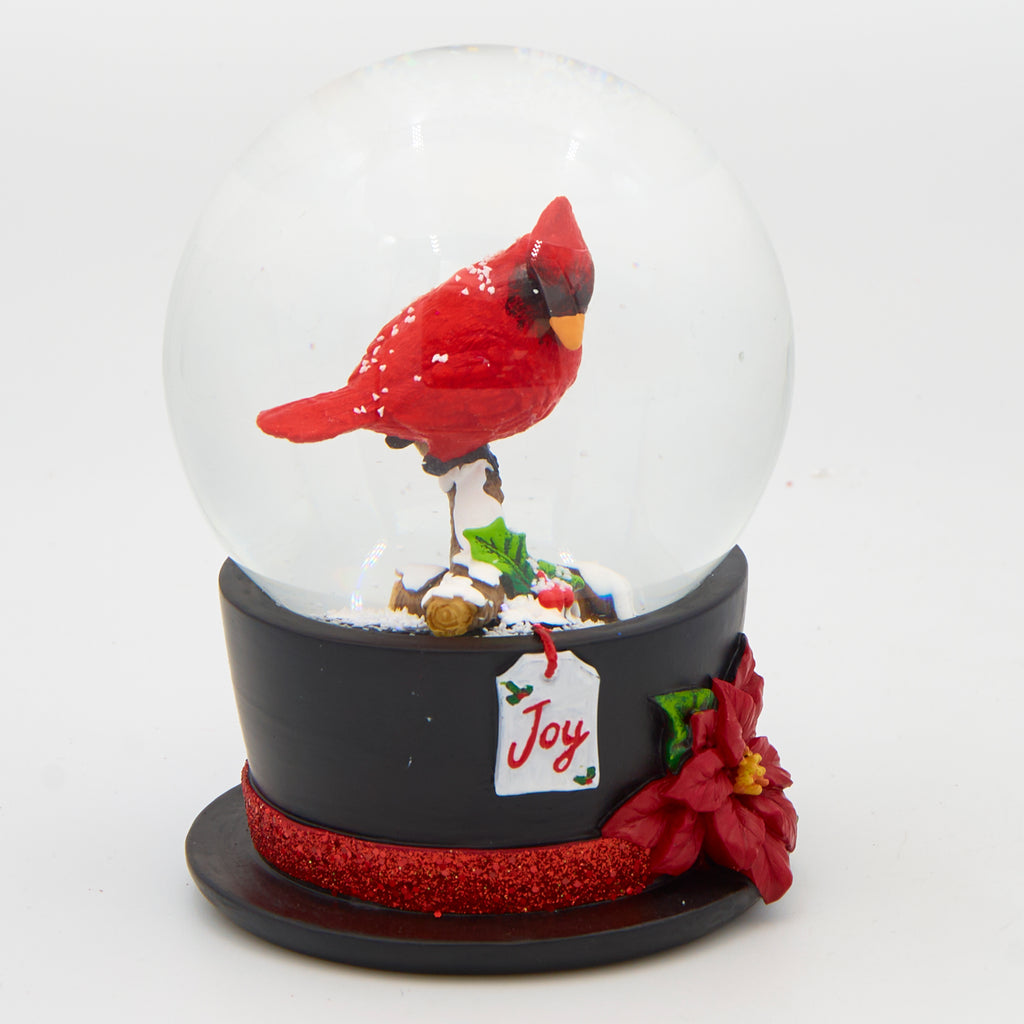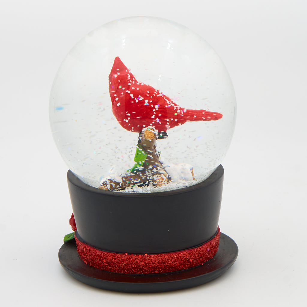This elegant snow globe captures the beauty of the season with a vibrant cardinal perched proudly atop a classic black top hat, accented with festive greenery and berries. A piece that adds warmth, color, and charm to any holiday décor display.