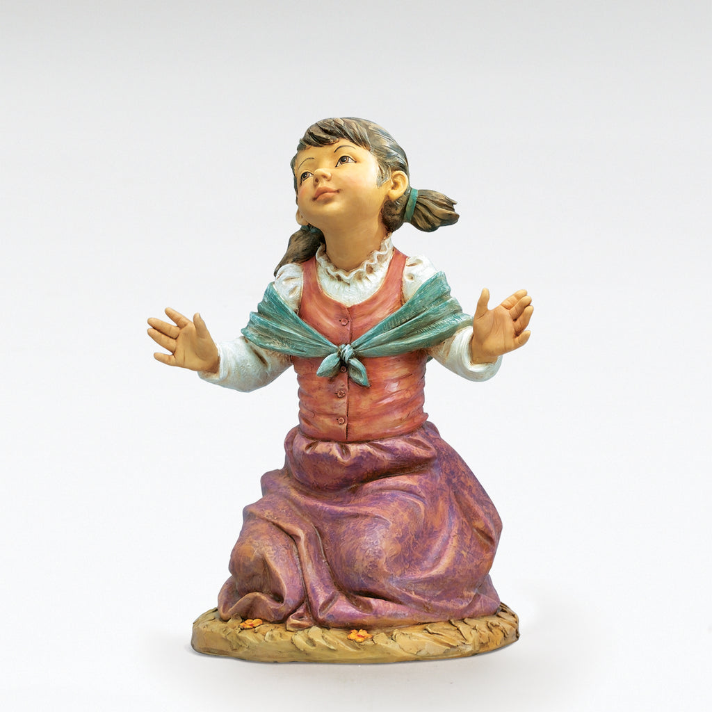 Beth is shown with hands uplifted and face turned toward the heavens, her expression filled with awe and wonder. Dressed in vibrant tones with beautifully sculpted folds in her garments, she brings a sense of innocence and devotion to any large-scale nativity. This figure captures the childlike joy of worship, making her a moving addition to your collection. She makes a captivating and heartfelt addition to large home or church nativity displays.