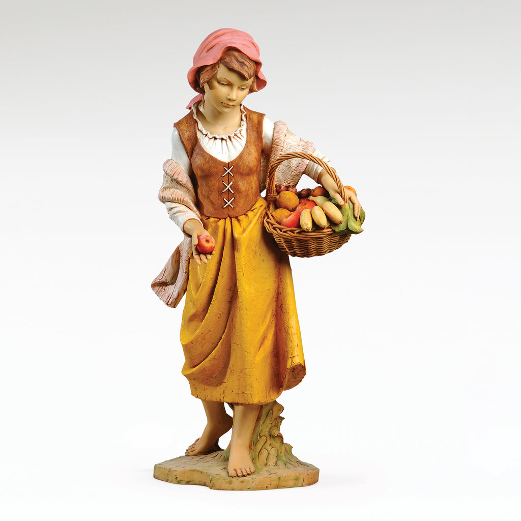 Talia the Young Villager carries a basket overflowing with fruits and vegetables, a symbol of daily life and offering. With her head bowed gently and a piece of fruit in hand, she reflects the simple devotion of bringing one’s gifts before the Christ Child. Her bright garments and barefoot stance capture the humble beauty of village life, adding authenticity and grace to large-scale Nativity scenes. This figure enhances both larger home and church displays with a touch of warmth and reverence.