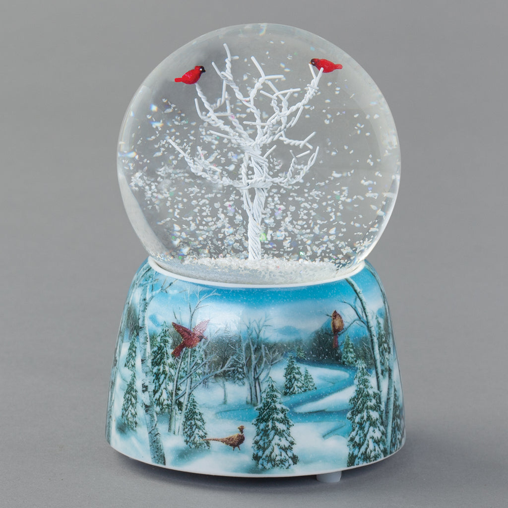 Add a touch of winter wonder to your home with this beautifully crafted Musical Cardinals Glitterdome. Featuring two vibrant red cardinals perched on a snow-covered tree, this globe captures the peaceful beauty of a snowy woodland scene. The intricately painted base showcases a serene forest landscape with cardinals nestled among snow-laden evergreens—bringing warmth and charm to any seasonal décor.